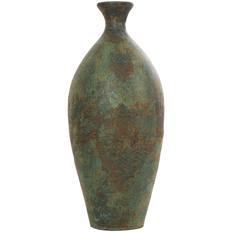 - The antique-style vase comes in a distressed green and rust metal color, exuding a rustic and weathered appearance