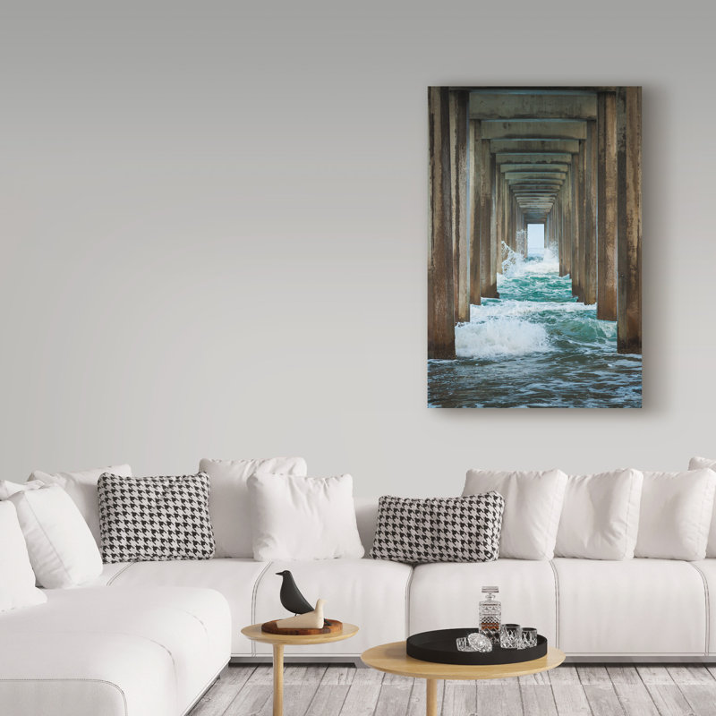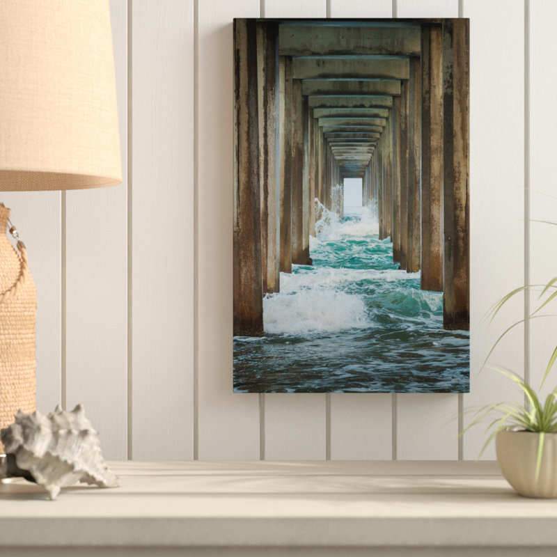 - This ready to hang, gallery wrapped art piece features waves crashing under a pier