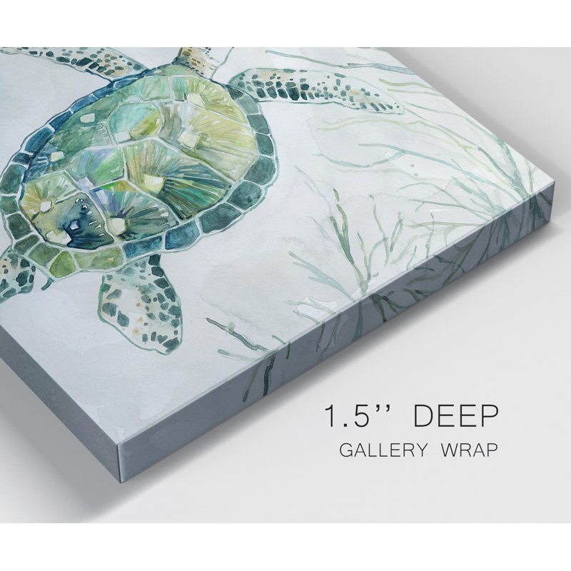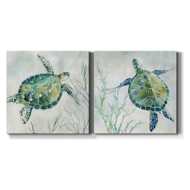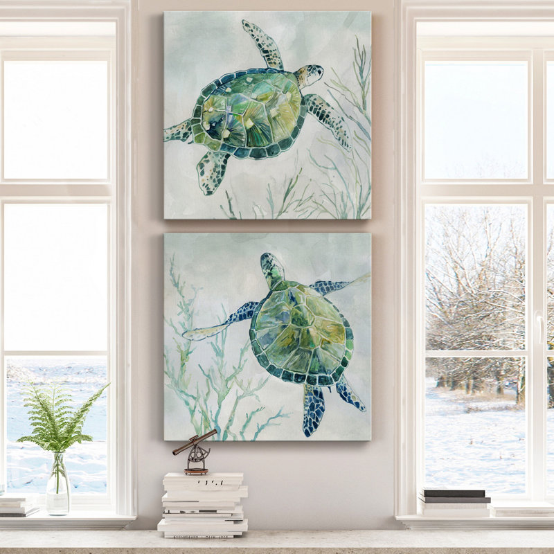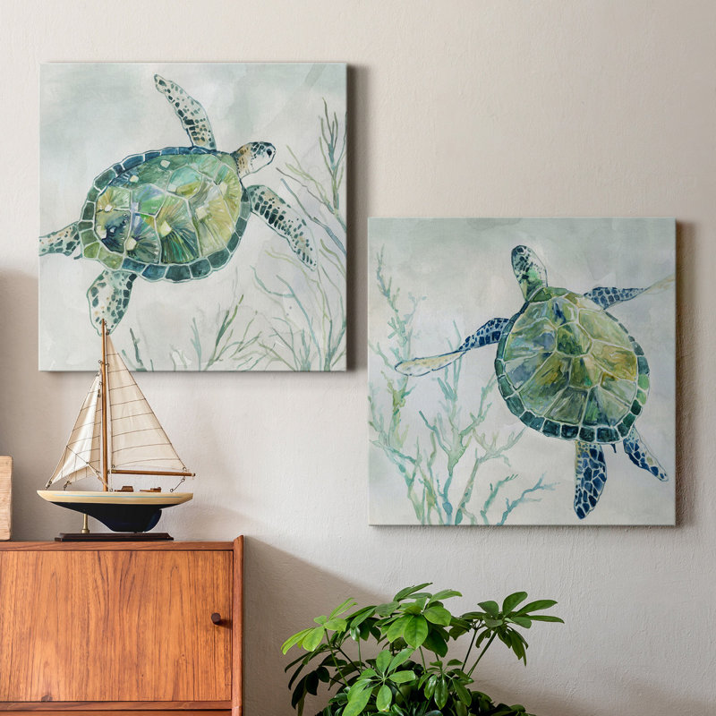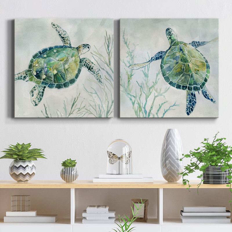 This 2-piece set of block painting prints brings a bit of the ocean to your walls with its two swimming sea turtles floating above the algae. Vibrant blue, green, and yellow hues stand out from the swirling gray background for a welcoming coastal vibe anywhere in your home. Each painting is printed on a square-wrapped canvas with a beveled stretcher bar in the back for a gallery-worthy look. Hanging hardware is included, so you can mount these pieces up right when they arrive.