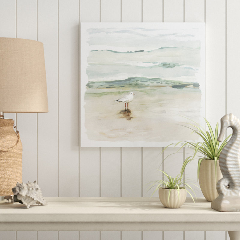 This painting print brings a seaside scene and coastal hues to your bedroom or living room wall. Originally created with acrylic paints, this piece is printed on a square-shaped wrapped canvas. It depicts a seagull standing on the beach as the waves roll onto the shore, in a soothing palette of white, beige, and blue. With its beachy theme, this wall art piece complements nearly any coastal farmhouse decor. Plus, wall-mounting hardware is included for easy hanging.