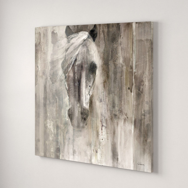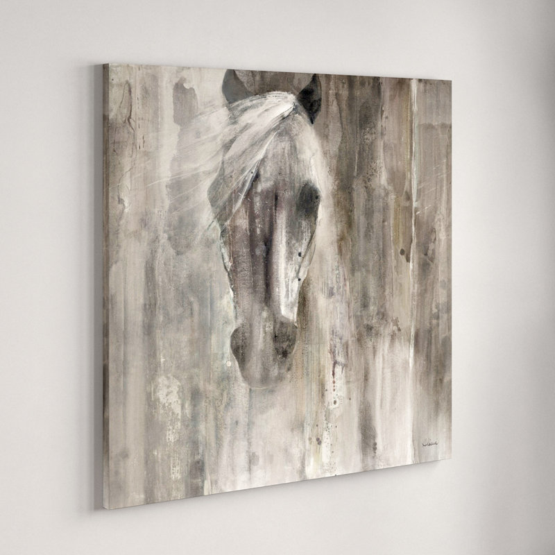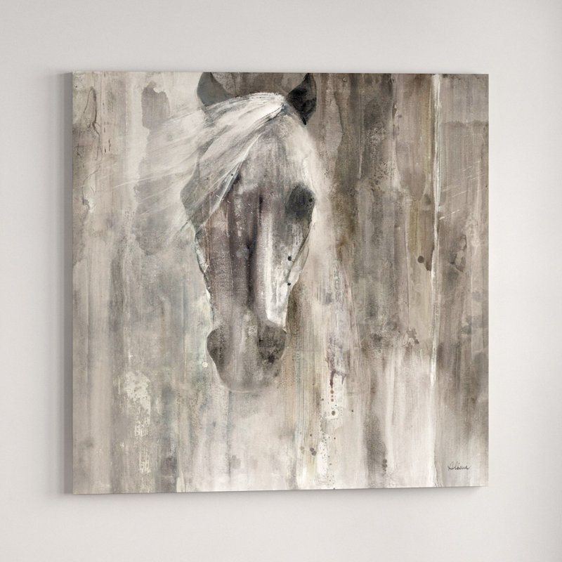 This painting print brings rustic, equine energy for a natural look to your home. It showcases the face of a gallant white horse against a gray and white background with lots of fading, adding plenty …. Read More.