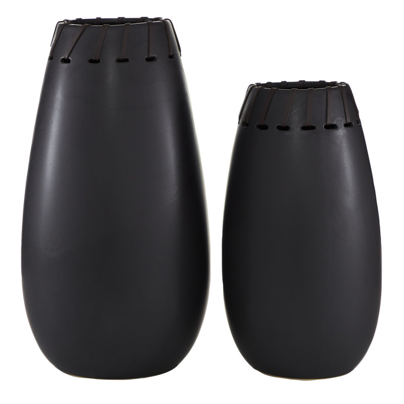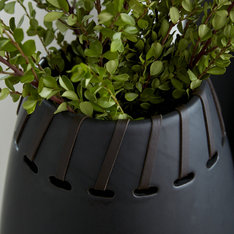 - Smooth round vases taper up towards the large mouths with pierced oval cutouts woven with black faux leather accents.