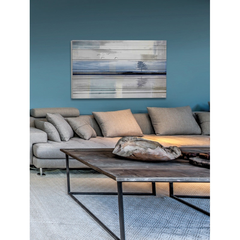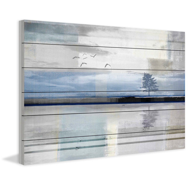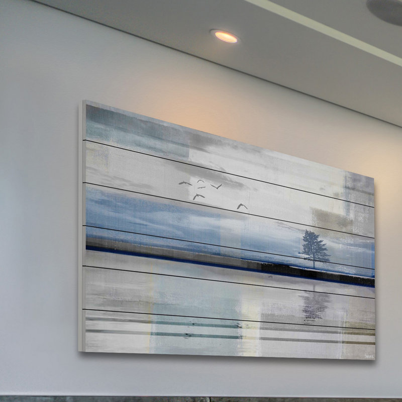Set a serene mood in your space with this rectangular watercolor print by artist Parvez Taj. Entitled “Shimmering Reflection,” this piece is printed on natural pine wood panels and depicts a lone tree and birds in flight against a simple landscape, all rendered in watercolor shades of blue, gray, and black. This print has two wall hooks and includes mounting hardware, so it’s easy to hang over your couch, bed, or dining table in your coastal home.