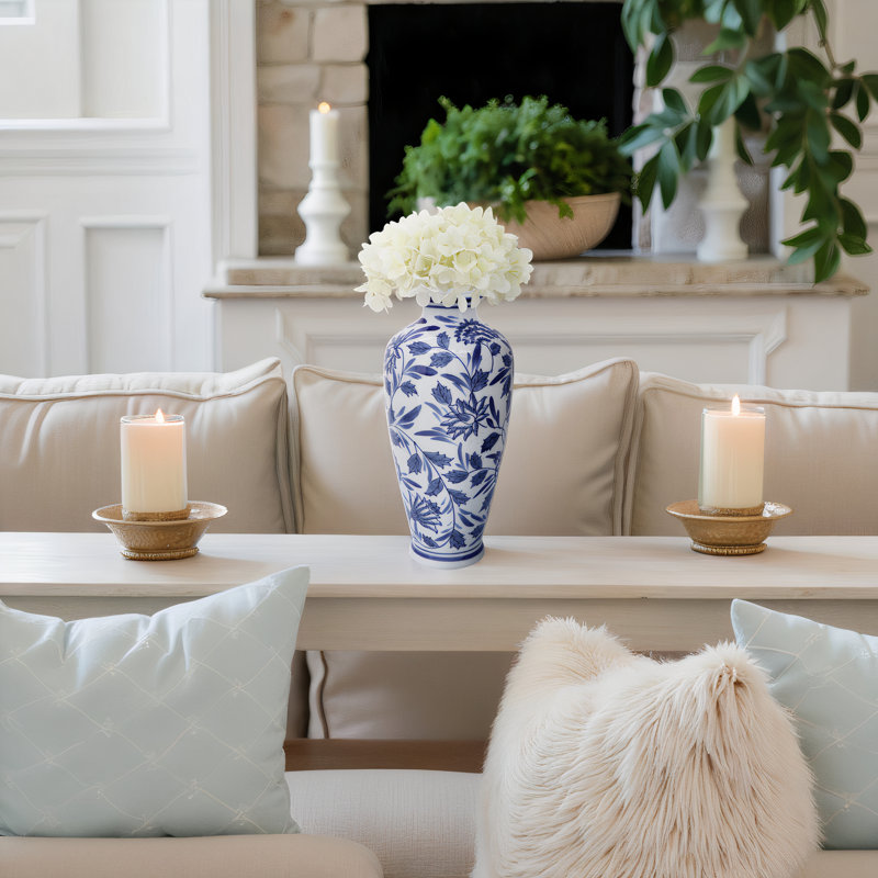 This chinoiserie-style ceramic vase adds a timeless layer of design with its intricate floral motif and glossy finish. Crafted with care, it blends traditional inspiration and modern structure, making it a versatile piece for curated shelf moments, entryway displays, or console tables. Use it as a bud vase for delicate stems or combine it with a small vase arrangement to add contrast in shape and scale. Its vertical silhouette provides height without overpowering smaller surfaces. Whether styled solo or in a trio, it enhances transitional, classic, and even global-inspired rooms. Designed for flexibility, it works just as well as an outdoor vase in protected spaces like covered patios or sunrooms. The smooth ceramic surface, reflective finish, and elegant blue-and-white palette make this a staple for year-round styling, adaptable to both formal decor and everyday living spaces.