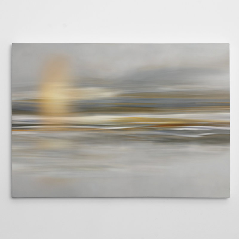 This graphic art print features an abstract re-imagining of the seashore, bringing a modern touch to any room in your home. Soft brushstrokes blend gray, black, and gold hues to create a series of lines that form clouds and the ocean surface. There’s also a glowing section closer to the left representing the sun hidden in the haze. This painting is printed on a rectangular canvas and wrapped around a solid wood frame. Bonus: Wall-mounting hardware is included to provide hassle-free hanging right out of the box.