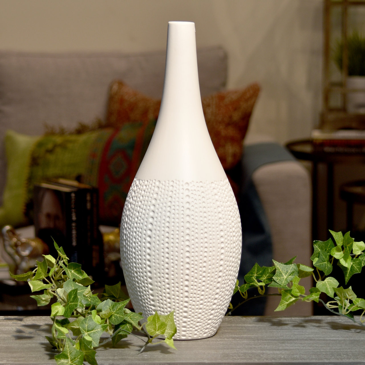- Long neck, smooth banded top rim, pimpled design body, and tapered bottom large matte finish