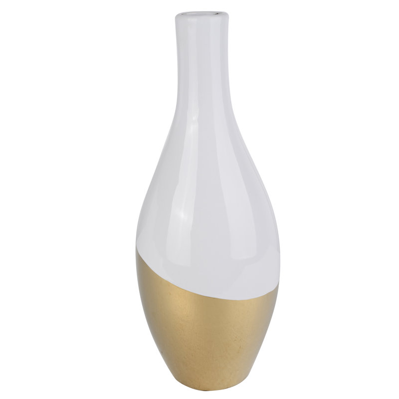 If you’re staging freshly-picked florals or simply looking for a piece of bold decor, this stylish vase is the perfect pick. Finished in glossy hues of white and gold, this chic vase is handcrafted of ceramic. Curved design and long neck give it an air of elegance. Let it hold a few blooming hydrangeas on your vanity for a garden-inspired morning prep space, or fill it with verdant grass for a minimalist foyer console display. This design is also perfect shining solo, so sit it among a collection of vibrant art books on the den etagere or let it put the finishing touch on your beautiful bedside vignette.