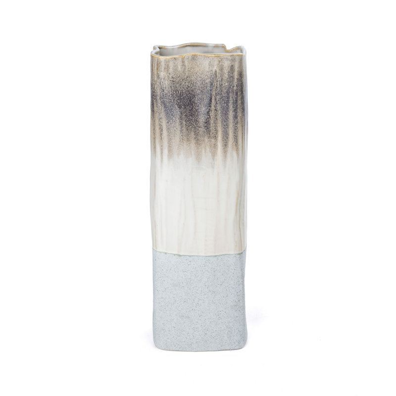 Complete your coastal decor with this eye-catching ceramic table vase. The rectangular shape is complimented with a tri-color ombre finish in earthy neutral browns and off-white, with a light blue-grey stone-like textured bottom. Equally beautiful filled with florals or sitting solo. Place it on a bookshelf, accent table, or mantle for that finishing touch. Display it in multiples or pair it up with its matching counterpart for a perfectly designed space. Each size is sold separately.