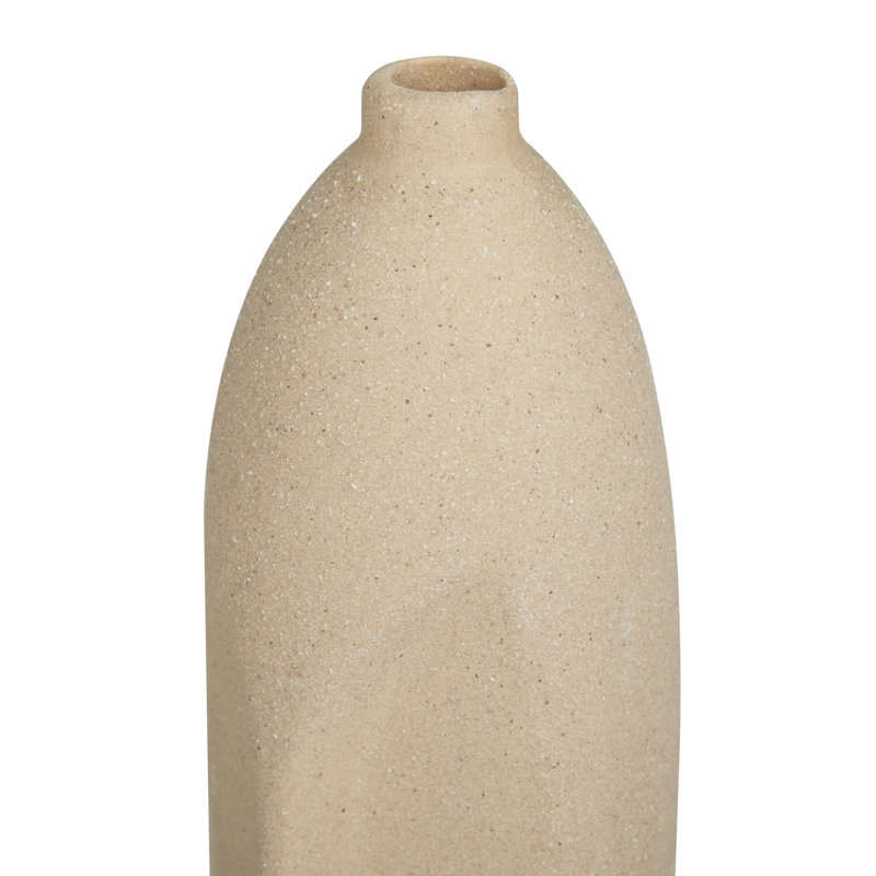 Use this beige set of 2 centerpiece vases to hold dried flowers in your living room space. Designed with felt or rubber stoppers at the base that prevent scratching furniture and table tops, as well as sliding around. Suitable for indoor use only. This beige colored stoneware vase comes as a set of 2. Contemporary style. Vases have 2 in, and 2 in mouth openings.
