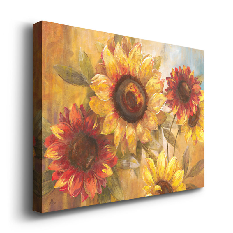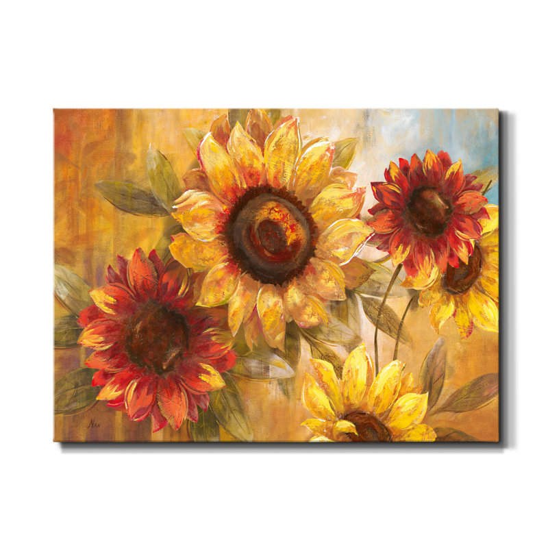 Bold and beautiful, this stunning painting print adds vibrant tones and a botanical subject to any room in your home. Large sunflowers take up most of the surface in warm yellow, orange, and red hues …. Read More.