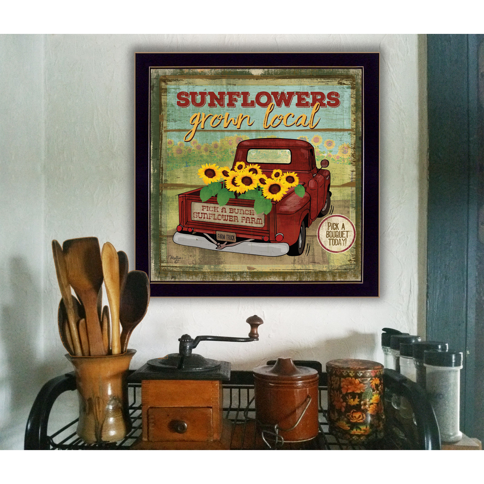 ‘Sunflowers from the farm’ is a 14″ x 14″ vintage pickup truck carrying sunflowers. This collection is framed in a decorative black frame ready to hang. The print has a protective, archival finish (glass is not needed) and arrives ready to hang.