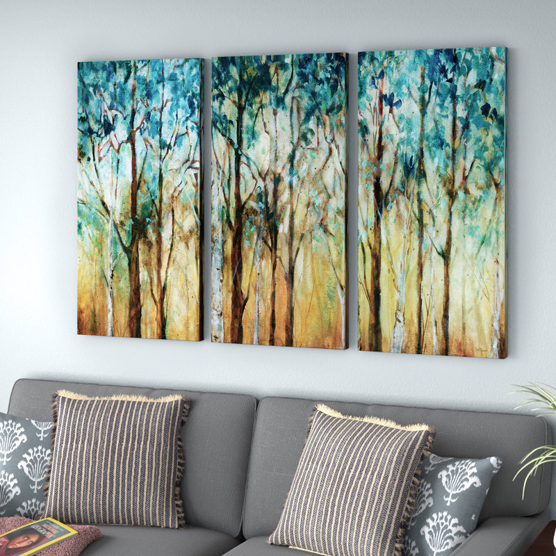 Spice up your decor and the walls in your home, with a fresh new piece of wall art. Use it to splash a burst of color to a plain and drab wall, and put your personality on display. This multi-piece image, for example, features a brightly colored image of an acrylic-painted forest. Made in the USA, this piece is printed on wrapped canvas, that has been hand-stretched with wood bars. Perfect for a country cottage aesthetic, it arrives ready to hang, with included wall mounting hardware.