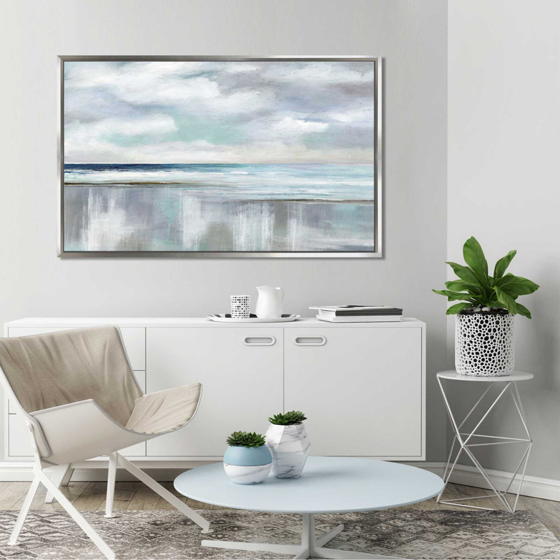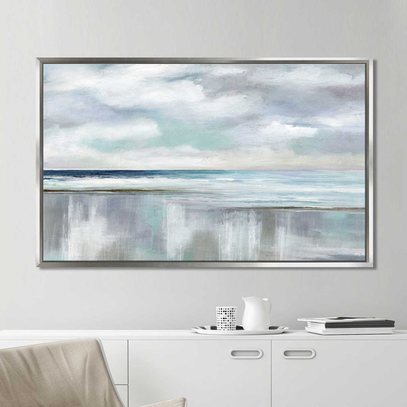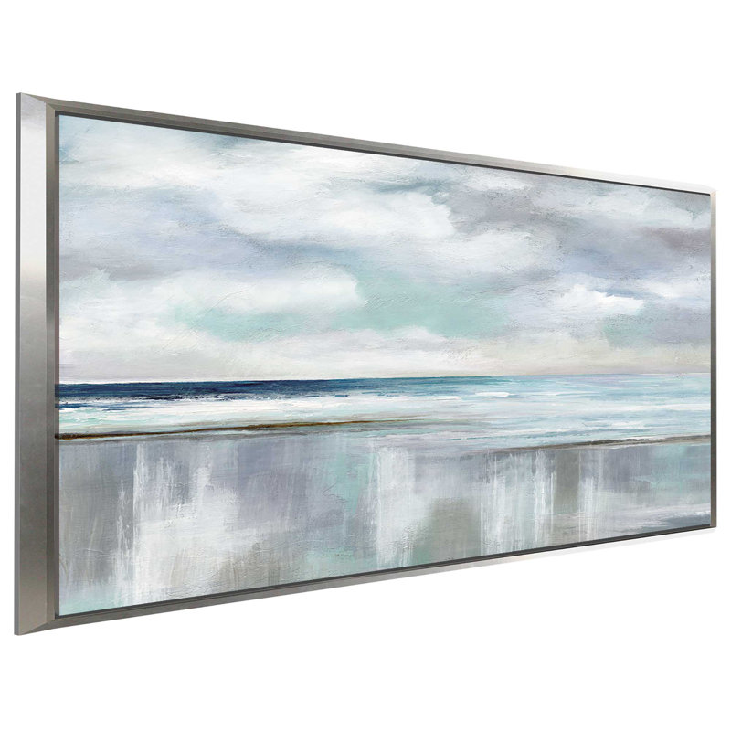 Seek to sea more. This wall art updates your coastal living room with a soft seascape. Originally an acrylic painting by artist Nan, it’s a reproduction printed with premium inks on artist-quality canvas for a gallery-worthy look. The design features a beach and oceanic horizon line in a dreamy color palette of grays and blues, with billowing clouds overhead. We love that this painting print with mounting hardware, so it’s ready to hang right out of the box.