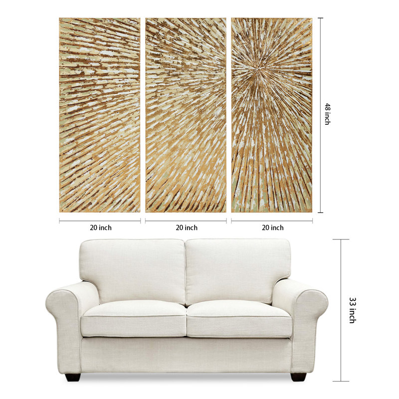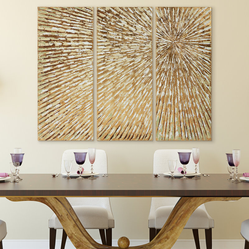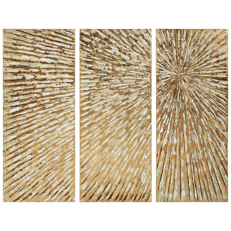 Are bare walls getting the better of you? Brighten up that stuffy study or lifeless living room with a piece of wall art that contributes to your home’s decor and shows off your style, like this piece! A bold accent on any wall, this hand-painted, three-panel piece features a bold sunburst with gold, silver, and brown lines that add a gleaming touch of texture to your home. Each panel of this triptych measures 48” H x 20” W x 2” D and is crafted from canvas wrapped around a wood frame.