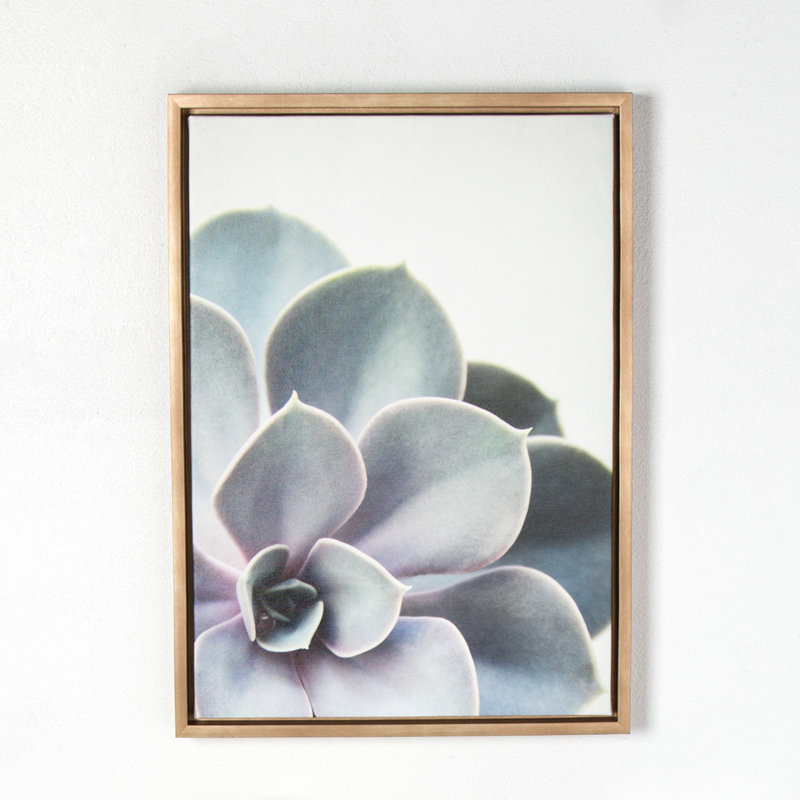 We love succulents. So why not add this sleek cactus print to your walls for some more greenery that you don’t have to water? On a white canvas, there is a printed image of a green succulent in the bottom left corner for some asymmetrical appeal. This piece is printed on 100% canvas using fade-resistant inks, so it will stay vibrant even when exposed to bright light. It is available in a brown plastic floater frame and measures 24” H x 18” W so it’s a good fit on your gallery wall. Hanging accessories are included so you can get right to decorating.