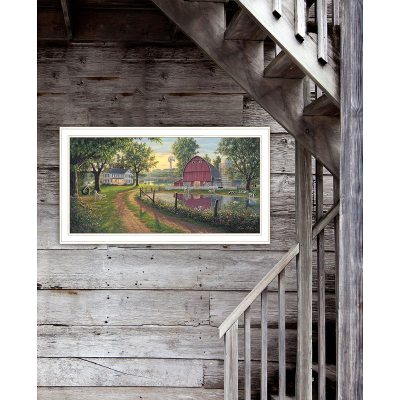 This piece of wall art is a colorful, tranquil depiction of small farm life. It showcases a child playing on a tire swing with his pup in front of a farmhouse, while cows graze on the pasture in front of a big red barn. The yellow and pink hues in the dusk sky complement the greenery of the farm to create a beautiful scene. This work is printed on paper and arrives in a wooden frame with beveled edges for a gallery-worthy look right out of the box.