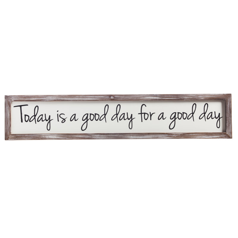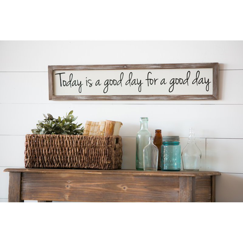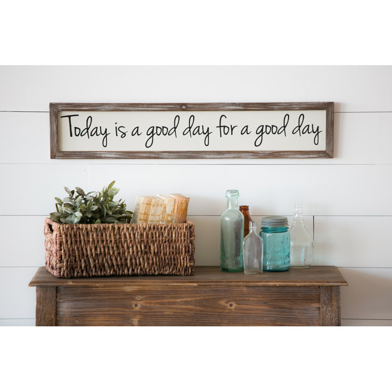 This textual art pairs a charming modern farmhouse look with a positive everyday message. It’s crafted from wood in a wide, narrow rectangle with a white solid white background and black text that reads, “Today is a good day for a good day.” We love the handwritten look of the font that adds to the rustic character. For the finishing touch, this wall art comes with a distressed wood frame and mounting hardware, so it’s ready to hang right out of the box.
