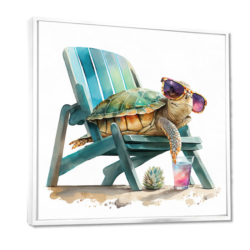 This wall art print features a whimsical scene of a turtle lounging on a beach chair with sunglasses, adding a playful touch to your space. The canvas is crafted from cotton and showcases a watercolor…. Read More.