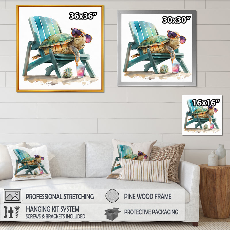 This wall art print features a whimsical scene of a turtle lounging on a beach chair with sunglasses, adding a playful touch to your space. The canvas is crafted from cotton and showcases a watercolor painting technique that brings a sense of tranquility to your home or office. We love that the square shape and versatile hanging orientation options make it easy to incorporate this piece into various layouts. Mounting hardware is included. Makes a great gift for a beach or beach-themed house.