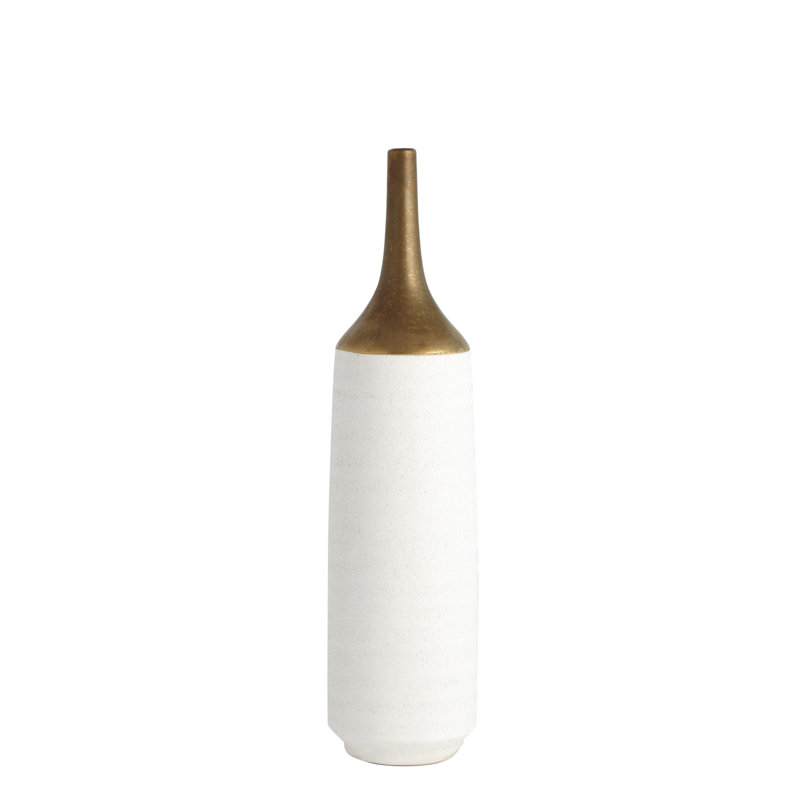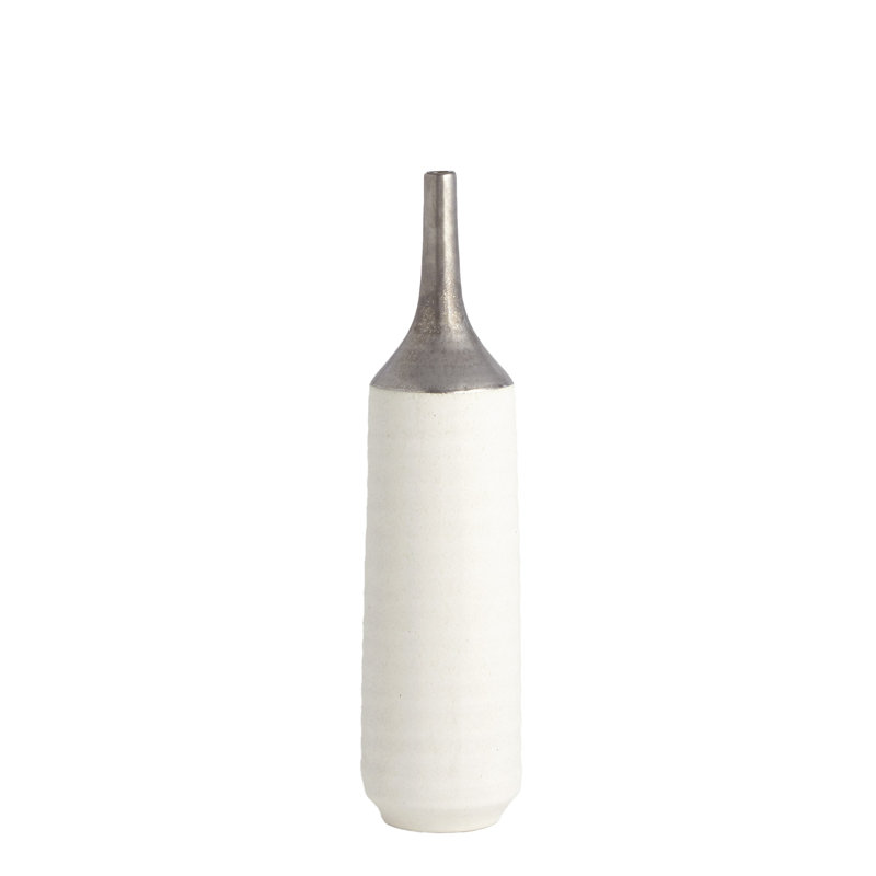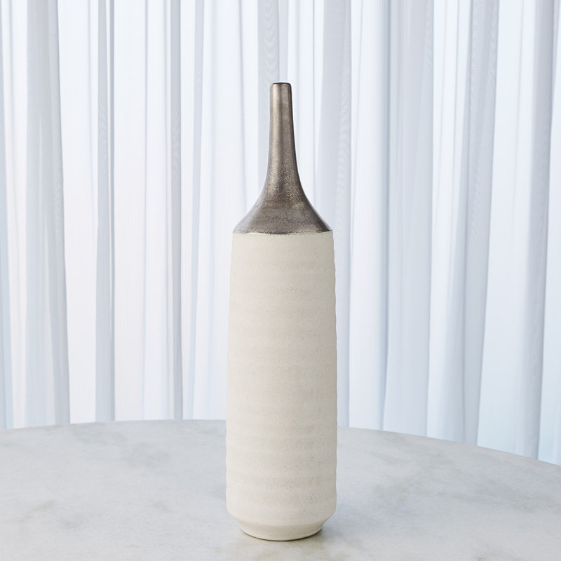 Our Two-Toned Vase is a slip-molded ceramic with a long, antiqued electroplated neck. A textured white glaze covers the remainder of the body….. Read More.