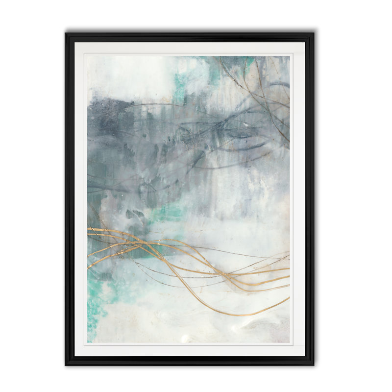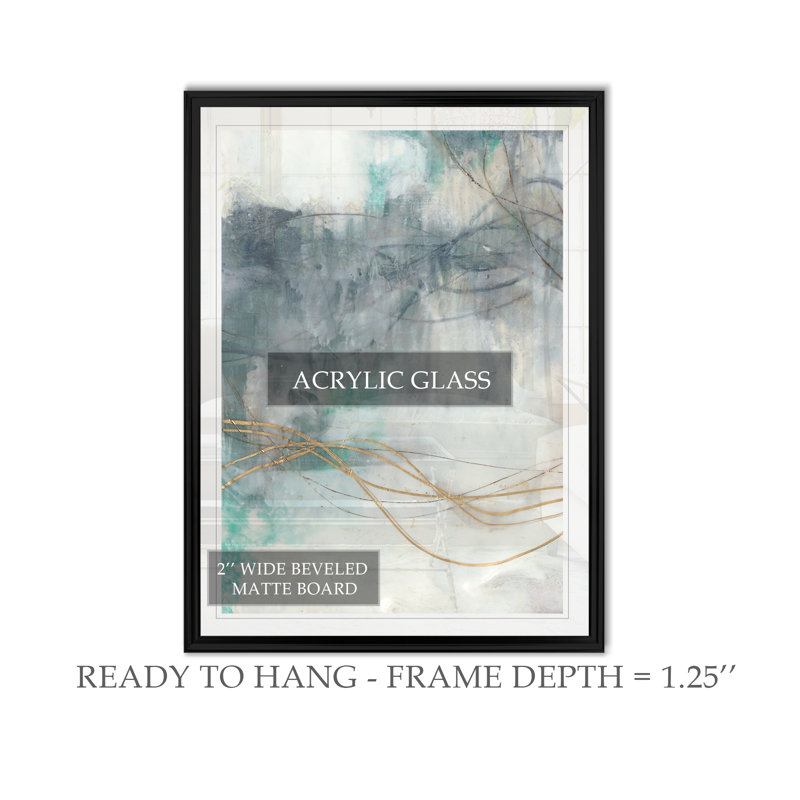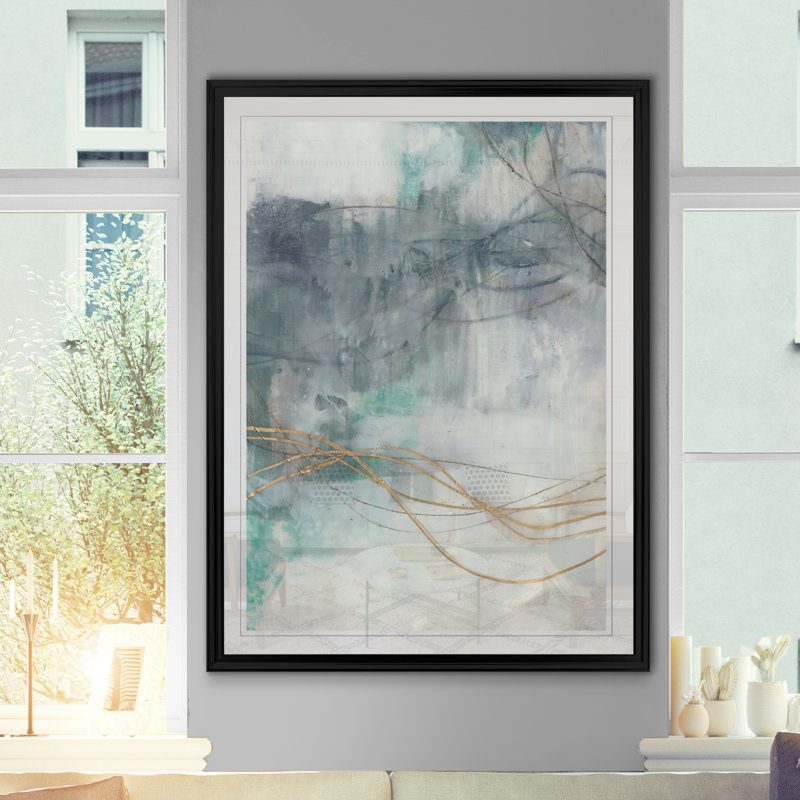 Add personality and modern style to your bare walls with this “Undulating Oro I” abstract art print. It’s printed in the USA, and it features swirling gold lines and geometric shapes against a faded white background, and it has a green and gray color palette for glam breezy style in your space. This giclee print comes in a variety of sizes, and it can be hung vertically or horizontally on any wall. It also has several different frames to choose from that best suit your decor. Plus, it includes wall mounting hardware so you can hang it right out of the box.