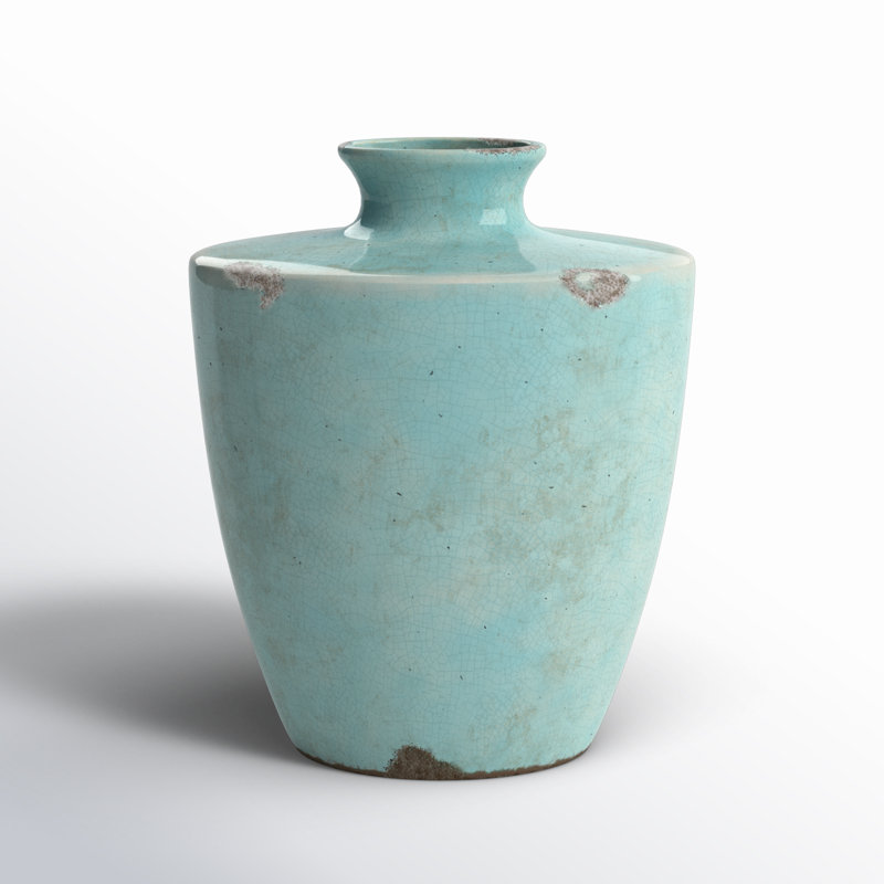 Bring some classic French country style to your space with this eye-catching table vase. It’s crafted from terracotta with a delicate blue glaze, and it showcases a shimmery patina that catches the light in a cheery sunroom or an airy kitchen counter. The rounded silhouette features a classic gourd shape with a narrow neck and opening. Plus, it measures a little over 9″ tall, making it ideal for big and small spaces alike. Whether you want to show off your green thumb or just add a distinctive accent, this vase is here to help.