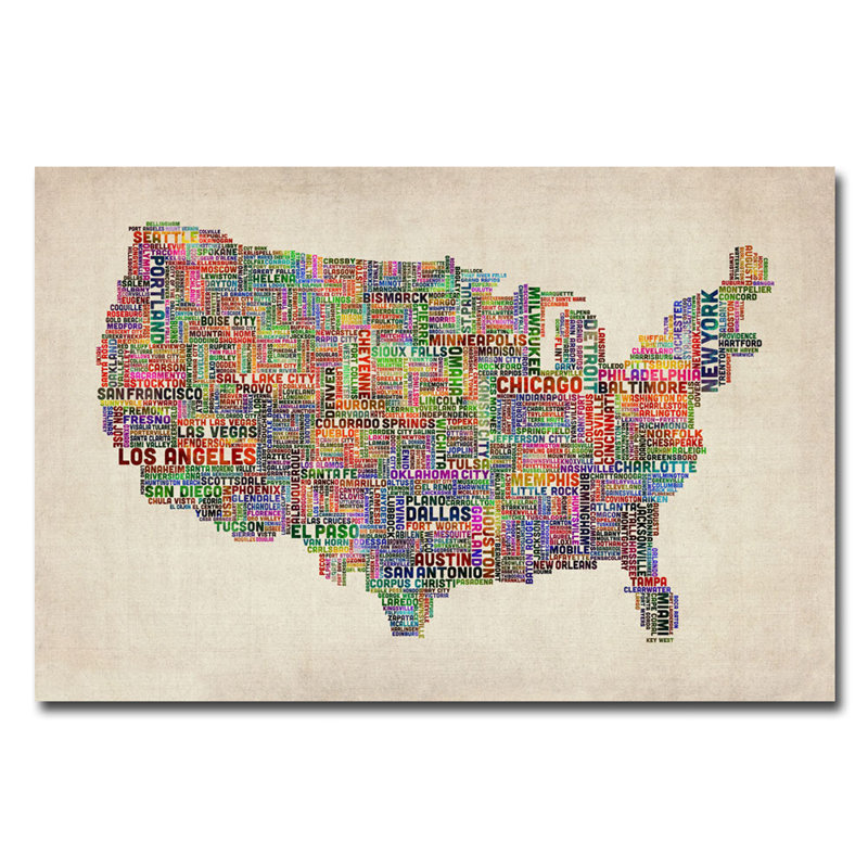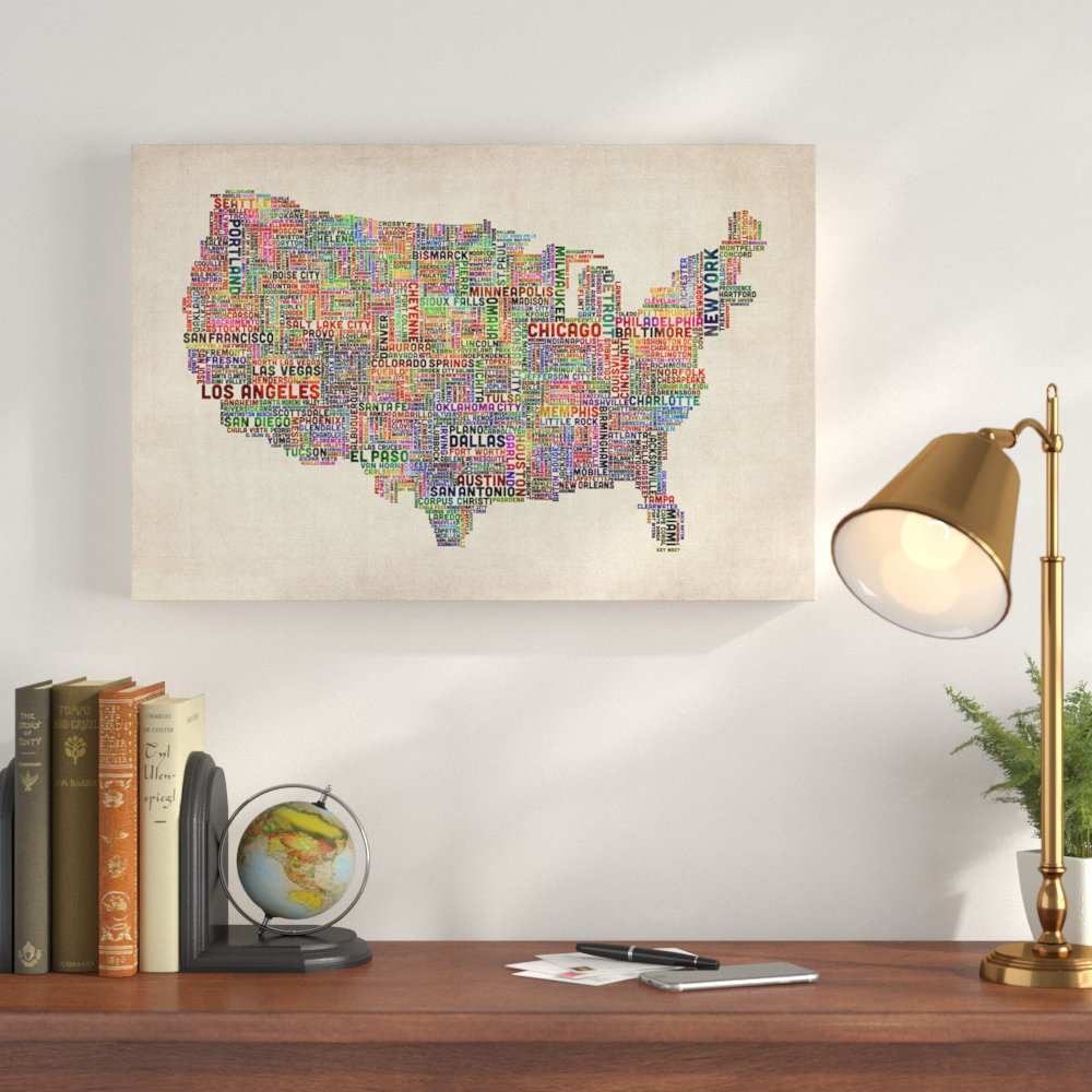 Bedroom ,or Office Décor – 16×24 ,Wrapped Canvas Wall Art – Michael Tompsett 'Us Cities Text Map Vi' Wall Art for Living Room |