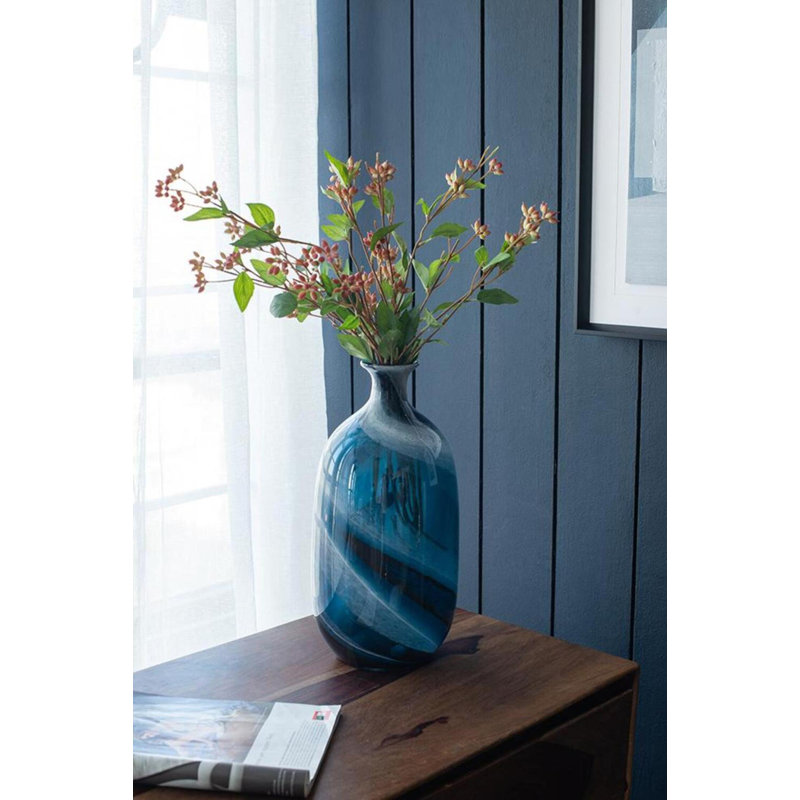 - Masterfully made by skilled artisans, this decorative vase boasts a smooth, curved body, a tapered neck, and a mesmerizing blue and white swirling finish that is embellished with delicate bubbles throughout