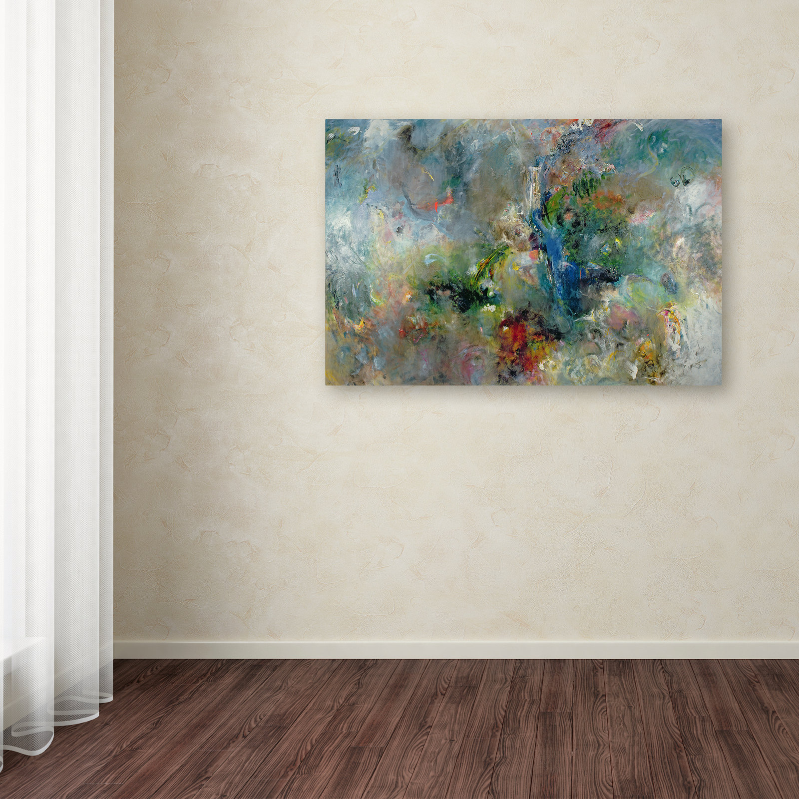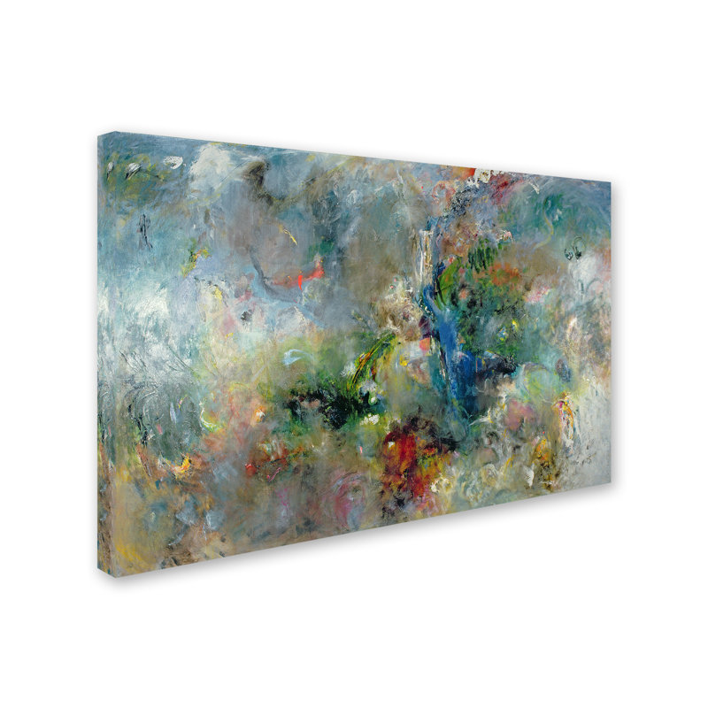 This ready-to-hang, gallery-wrapped art piece features an abstract painting featuring blue, green, and red brushstrokes emerging from a more neutral background. Giclee (jee-clay) is an advanced printmaking process for creating high-quality fine art reproductions. The attainable excellence that Giclee printmaking affords makes the reproduction virtually indistinguishable from the original piece. The result is the wide acceptance of Giclee by galleries, museums, and private collectors. Gallery wrap is a method of stretching an artist’s canvas so that the canvas wraps around the sides and is secured by a hidden, wooden frame. This method of stretching and preparing a canvas allows for a frameless presentation of the finished painting.