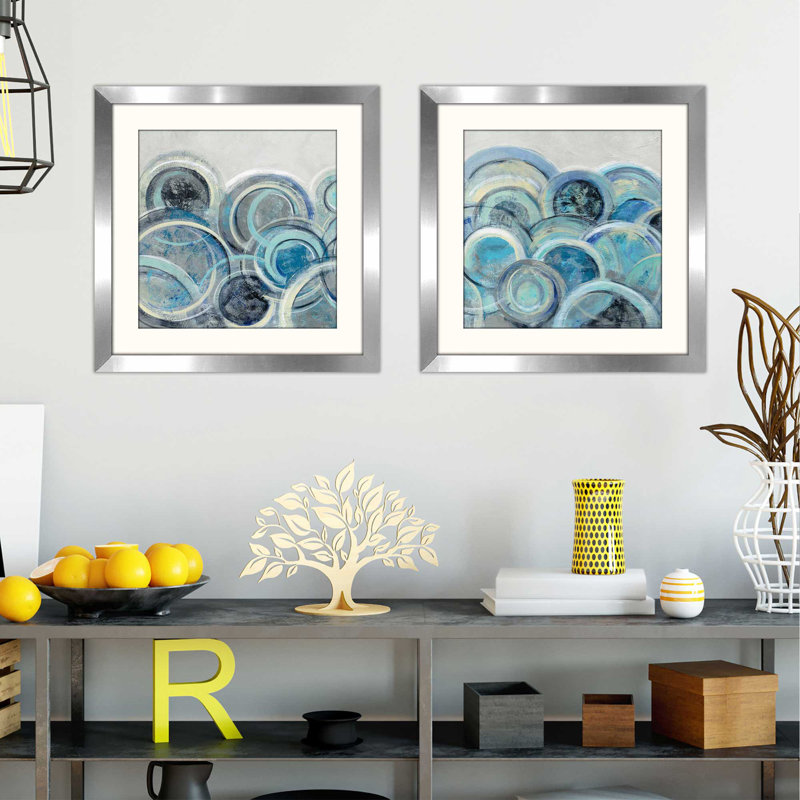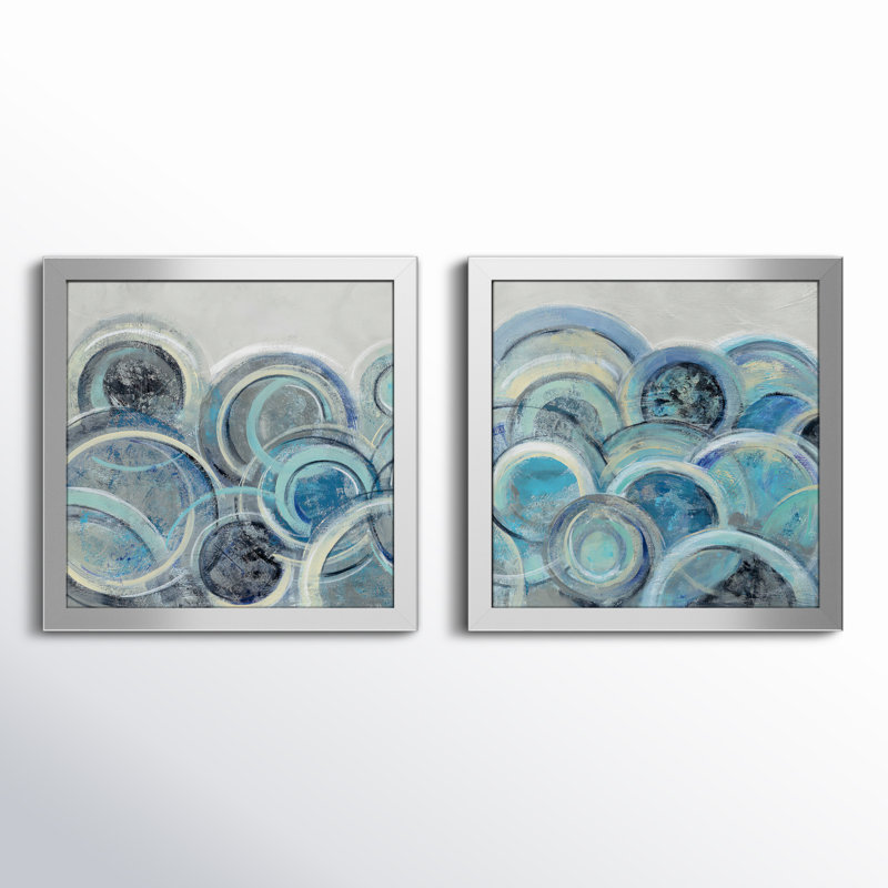 Arriving as a 2-piece set, this acrylic painting print features multiple circles that resemble bubbles or – when looking at it just right – swirling ocean waves. Varying shades of blue, yellow, and green bring a soothing vibe and a modern, abstract look to your walls. Reproduced from the original with the artist’s permission, this set is printed on paper using high-quality inks. It’s also lined with glass to keep dirt and dust from touching the surface, and it’s placed within a silver-finished picture frame.