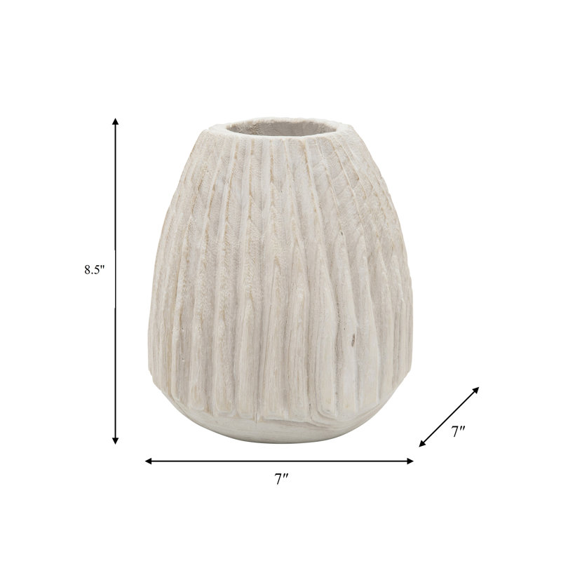 Enhance your home decor with this beautifully crafted white wood vase, designed to bring natural texture and timeless elegance into any space. Measuring 7x7x8.5 inches, this decorative vase features a ribbed carved design that complements casual home trends and adds effortless charm to shelves, coffee tables, desks, or bedside tables. Made from solid wood and finished in a neutral white tone, it seamlessly fits into a variety of interior styles, from modern farmhouse to minimalist and boho. Perfect for displaying dried flowers or styled as a stand-alone piece, this accent vase solves the challenge of finding versatile pieces that elevate your home without overwhelming it. Whether placed in your living room, bedroom, office, or entryway, it adds warmth and character with lasting appeal. Bring balance and beauty to your interiors?order this unique wooden vase today to elevate your everyday style.