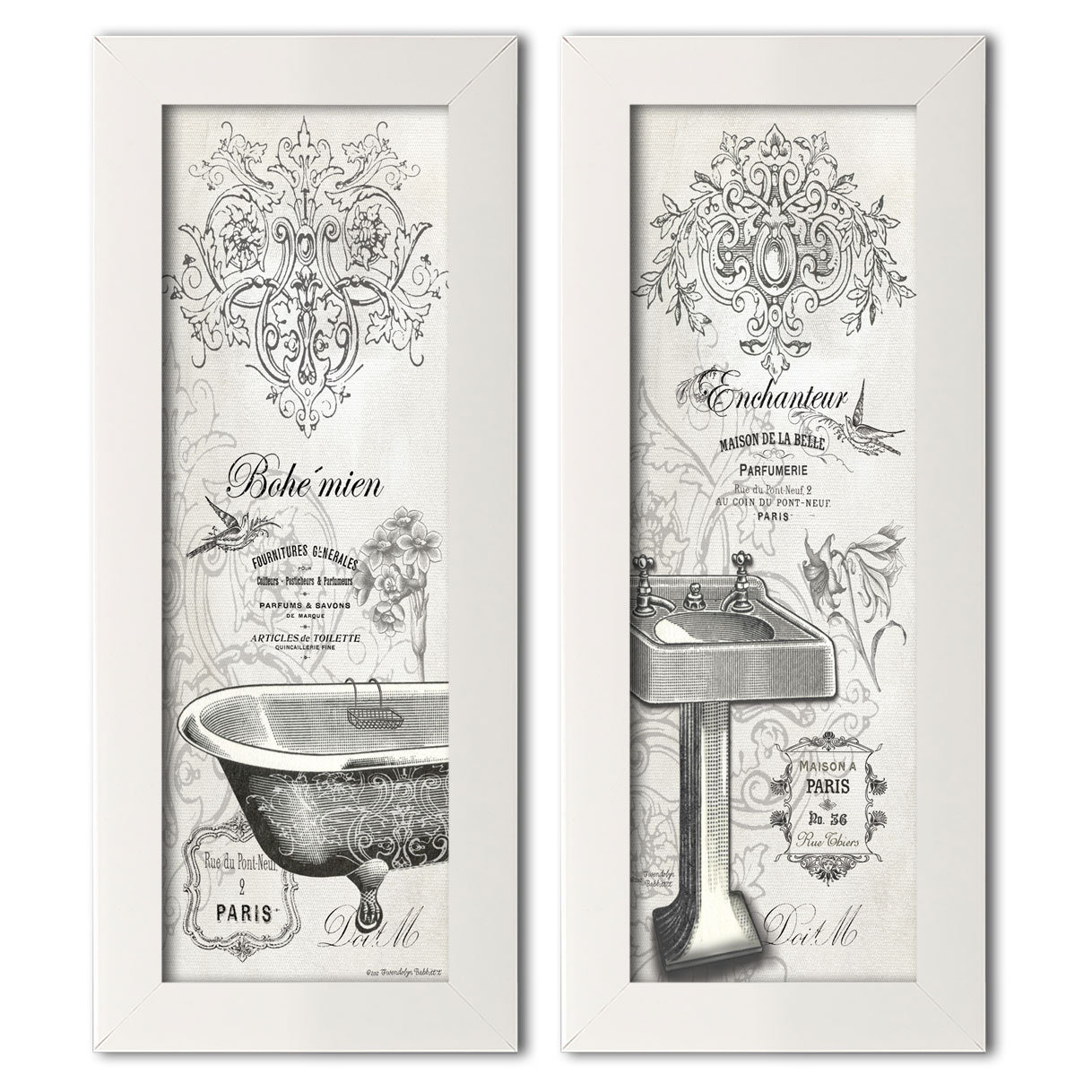 Looking to give your master bath or powder room a mini-makeover? This two-piece graphic art print set is a perfect pick for fans of French country style. Made in the USA, this set focuses on a vintage sink and claw-foot bathtub with fleur-de-lis accents, floral details, and French typography scattered throughout. Both panels are printed on paper and set in smooth white frames. Plus, they arrive ready to hang.