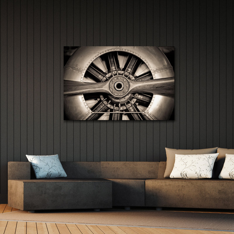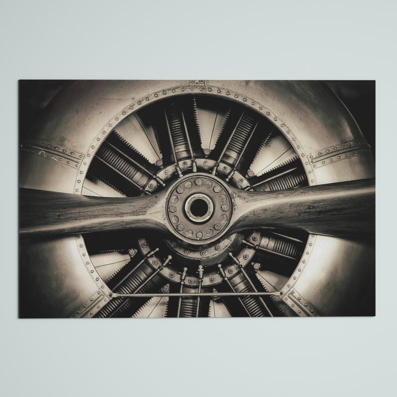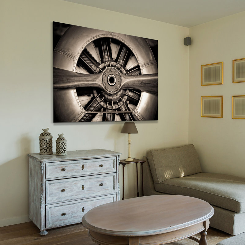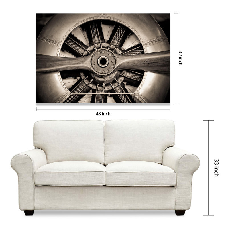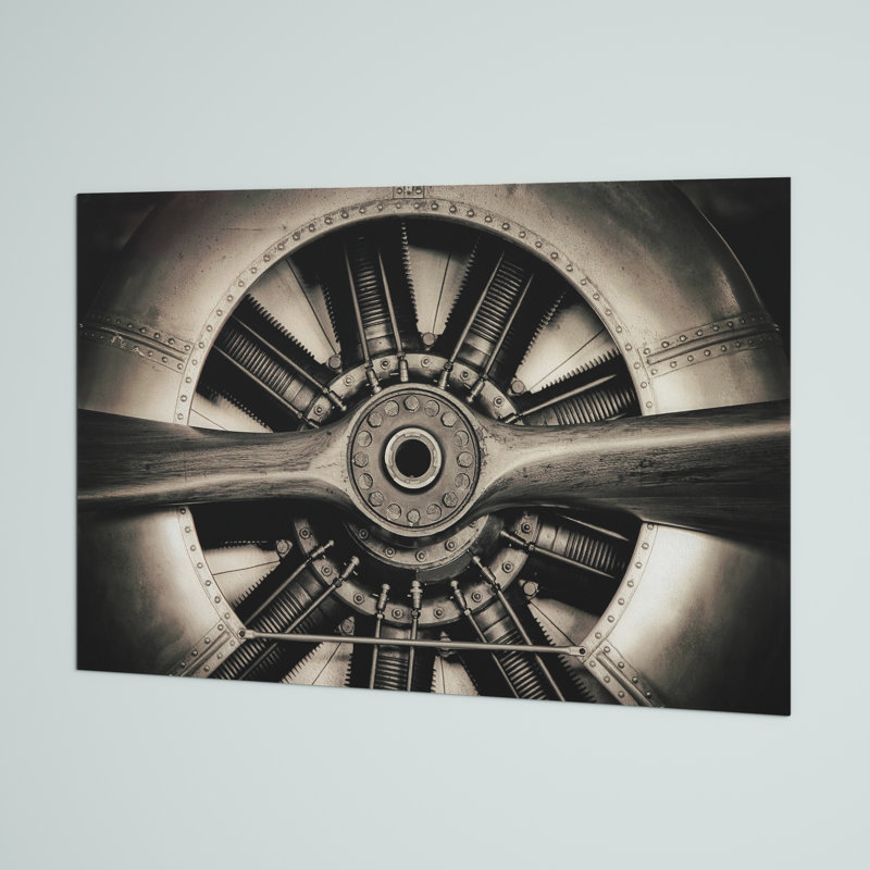 This large-scale photograph is printed on tempered art glass for a vintage look that complements the industrial image. It features a black and brown close-up of an antique two-blade airplane propeller and engine compartment. Measuring 48” wide and 32” high, it’s perfect for the focal point of your living room or bedroom. We love that it has a frameless and free-floating finish that makes this old-fashioned picture feel modern. Pick it up for yourself or your favorite aviation enthusiast.