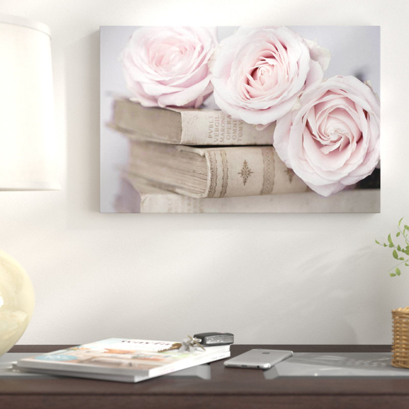 Bring a touch of sweet style to your walls with this beautiful photographic print. A perfect choice for glamorous aesthetics, this art blends natural beauty with a splash of chic flair. It showcases a trio of light pink roses resting on a stack of vintaged novels, one reading “Publi Vergili Maronis Opera Omni.” Try hanging this sophisticated art piece above your master suite headboard for a chic focal point in your restful retreat. If you want to give your whole room a refresh, top your bed with a ruffled white duvet, a large knit gray throw, and a few soft pink pillows.
