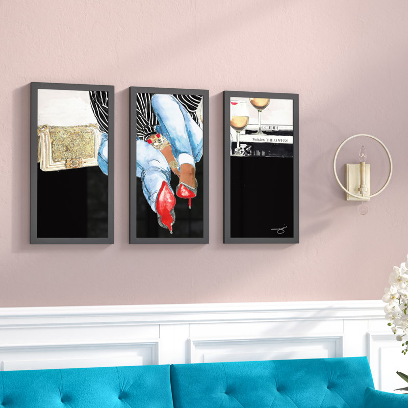 Featuring stacked style books, lipstick-stained wine glasses and, of course, red high heels, this multi-piece wall art screams “fashionista” in any space. This artful accent is printed on acrylic glass using a high-speed flatbed printer and is bordered by a black polystyrene frame. This three-piece set arrives ready for display with all required hardware. It’s up to you to find the perfect place to put it! To care for this product, simply wipe it down with a dry cloth.