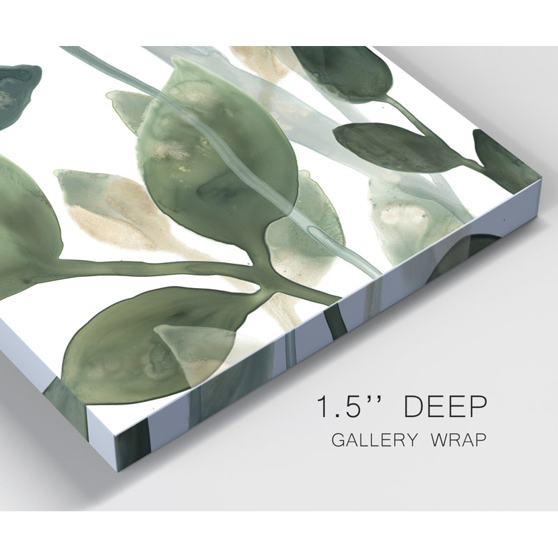 Bring a modern touch of beachy style to your accent wall with this canvas print. Showcasing an array of palm leaves, it features a contemporary composition with layered shapes and muted green hues. A printed reproduction of an original piece, this accent is printed on an artist-quality canvas using giclee inks and stretched over a wooden frame. We love that its clean-lined look brings a gallery-worthy feel to your space. Highlight: It comes with wall-hanging hardware, making it easy to install in your favorite room.