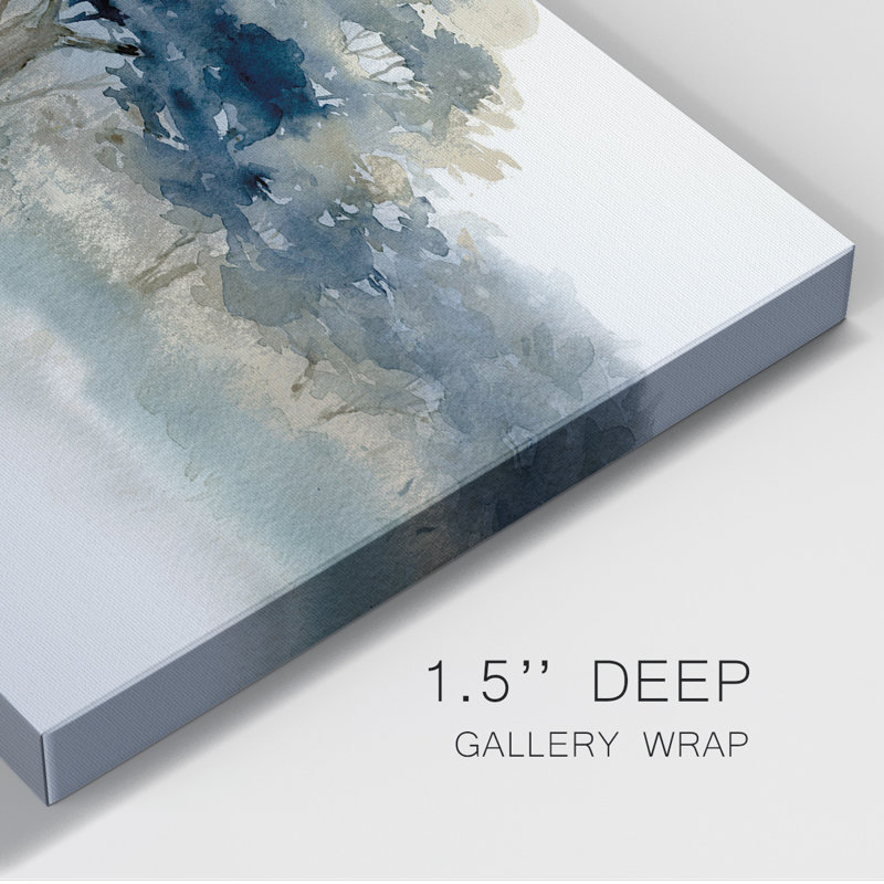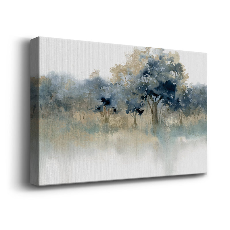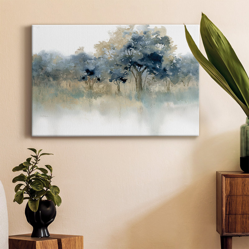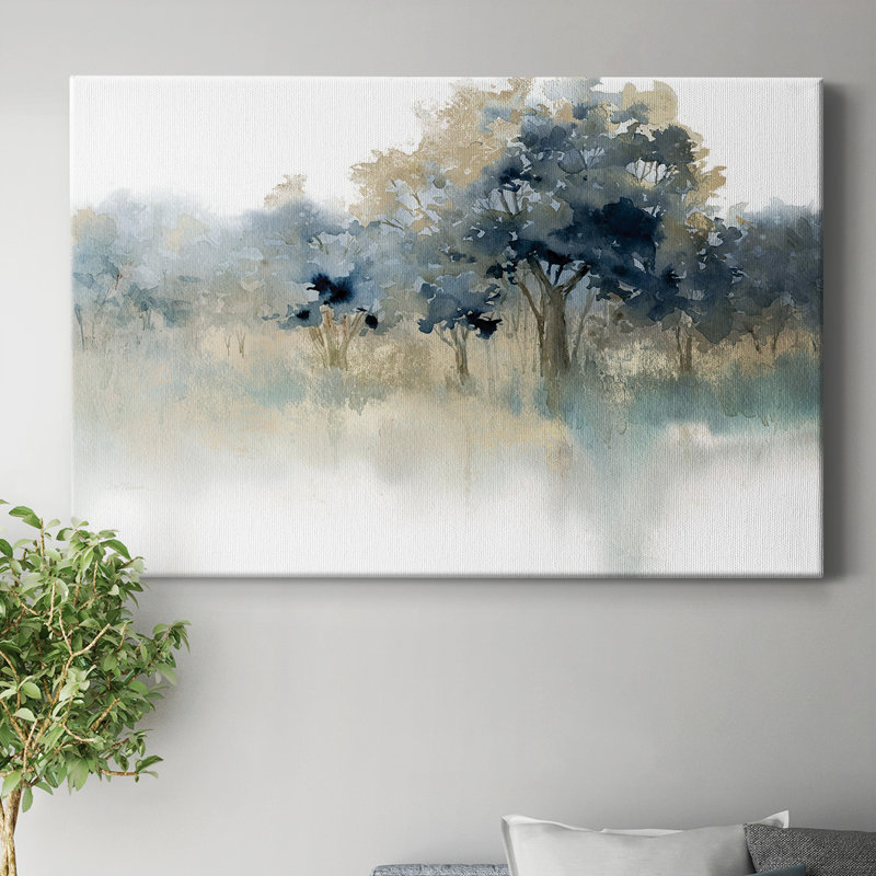 This painting print shows off a more abstract landscape that brings a classic look to any room in your home. Reproduced from the original work, it features a grove of trees in green, blue, and beige tones with an off-white background that makes it appear like the trees are floating in the mist. This painting is printed on a rectangular canvas, and wrapped around a solid wood frame for a gallery-worthy look we love. And a wall hook is affixed to the back for hassle-free hanging right out of the box.