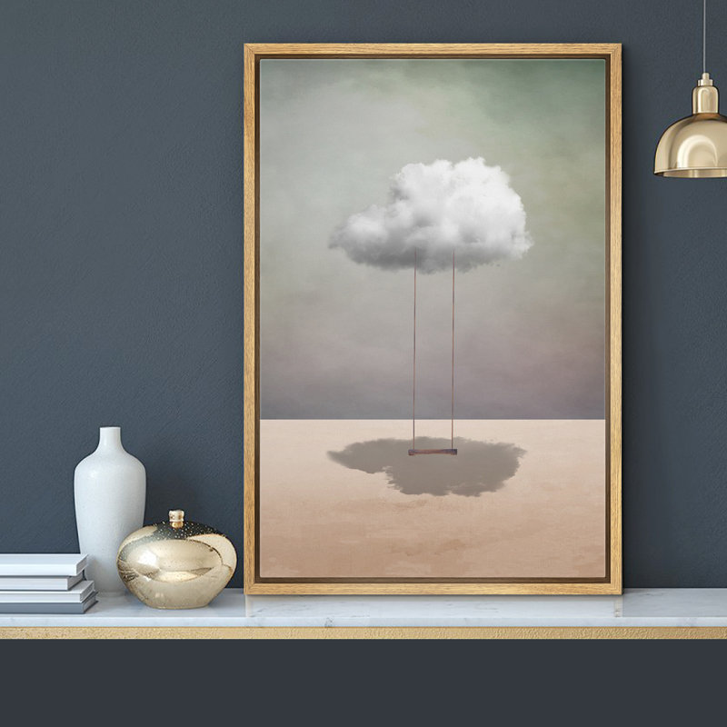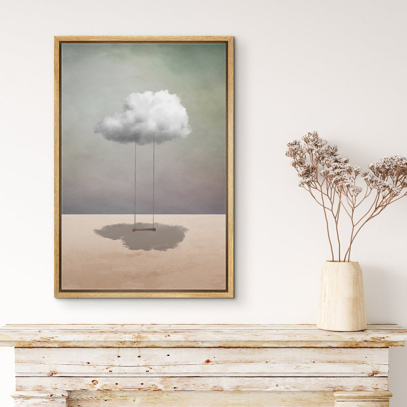 Whimsical Desert Swing On Cloud In Desert – Whimsical Surreal Pictures Neutral Framed Canvas Painting Print Wall Art