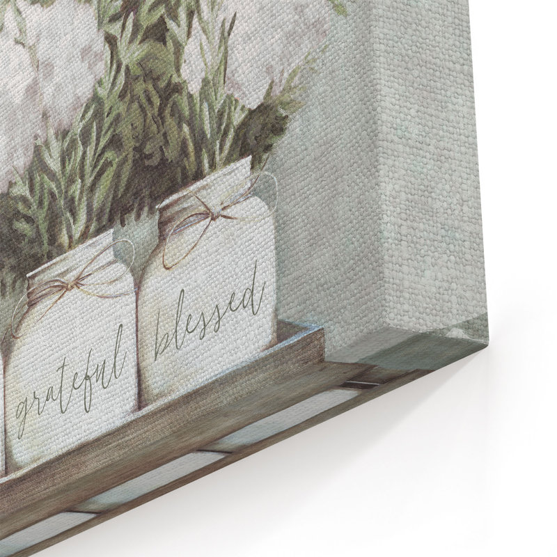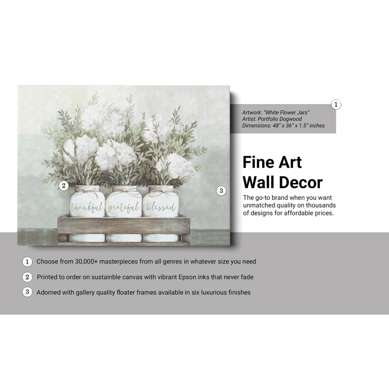 - About the wall art””White Flower Jars” by Portfolio Dogwood, depicting fresh hydrangea flowers in 3 white country mason jars with the words “thankful, grateful, blessed” tied up with twine and resting inside a worn wood crate.