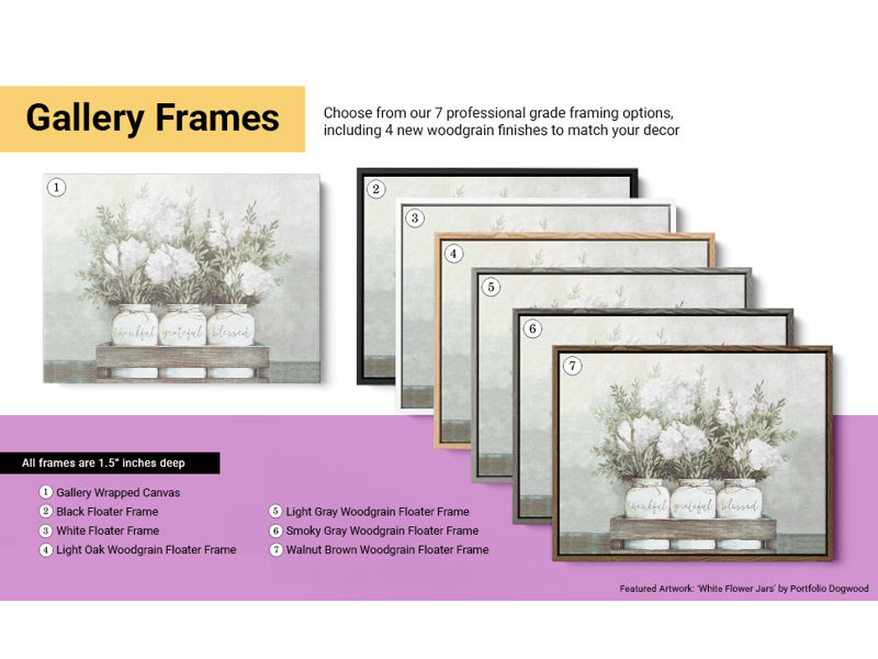 - Luxurious Frame Finishes”Choose from 6 stunning wall art gallery floater frames, including black, white, light gray, dark gray, walnut, white oak (or as wrapped canvas)