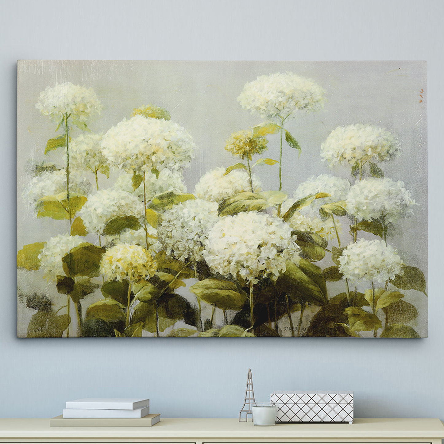 White Hydrangea Garden’ graphic art. The artist Danhui Nai was born in mainland China and raised in an artistic household with her sculptor father and painter mother. Her natural passion for art was guided through classical training which she applies in her California studio to create beautiful, on-trend artwork in a variety of media. She studied interior design later in Paris and New York City. She worked in the textile industry in Manhattan, where she continued her studies and artistic development.