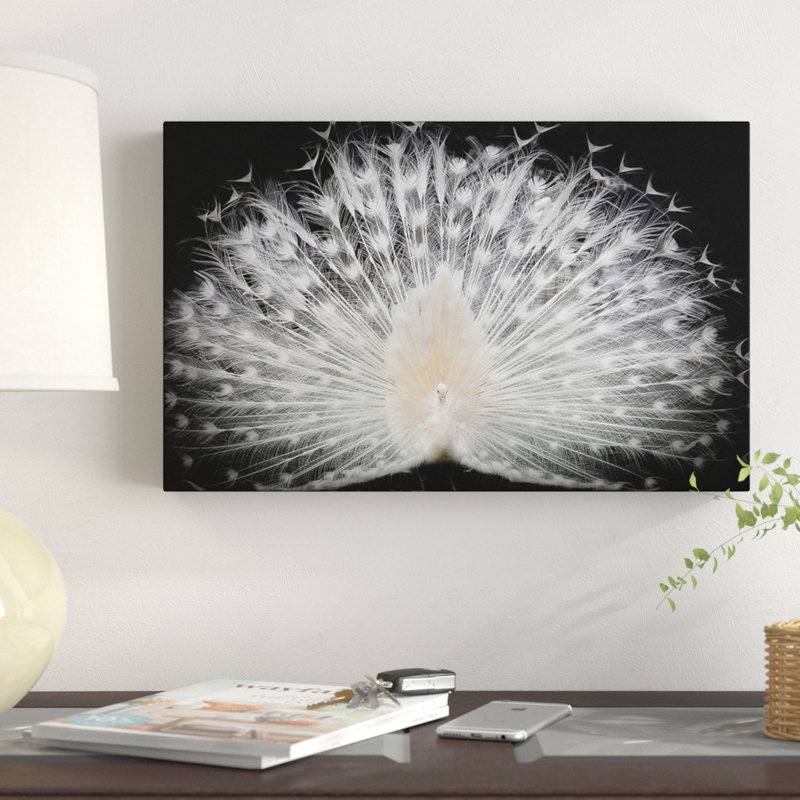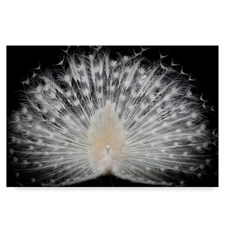 - This ready to hang, gallery-wrapped art piece features a white peacock in the center of the frame.