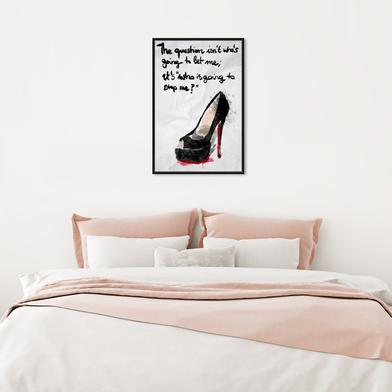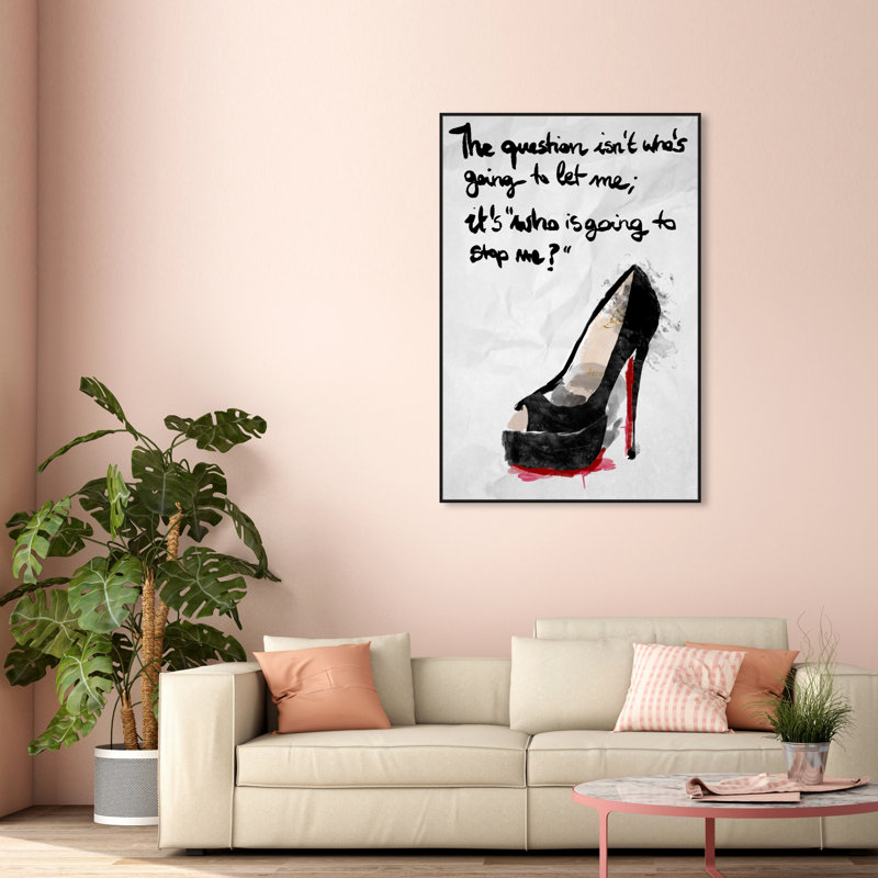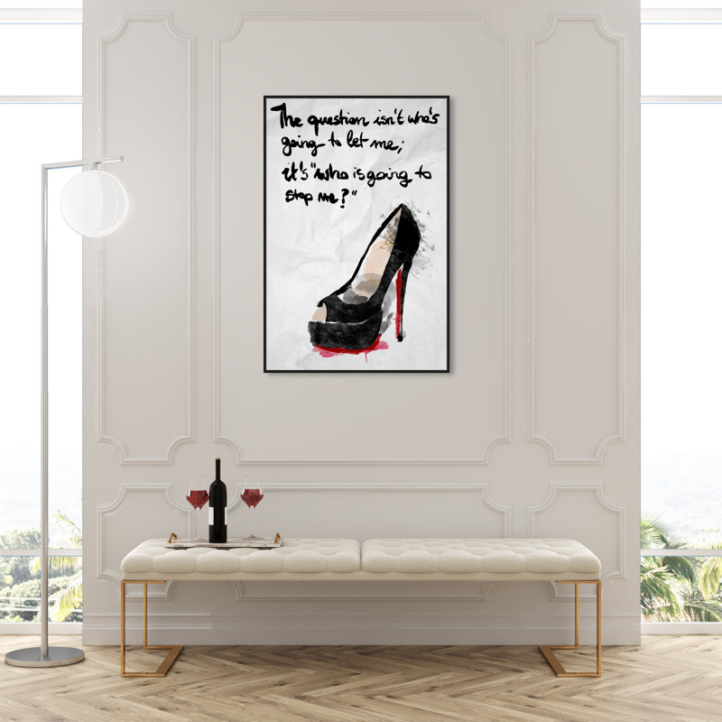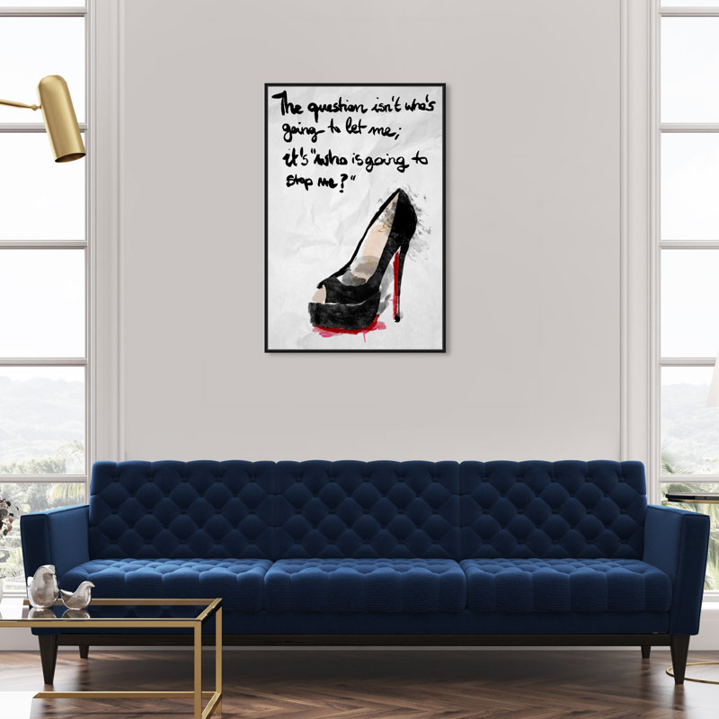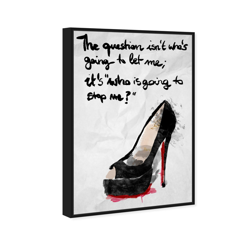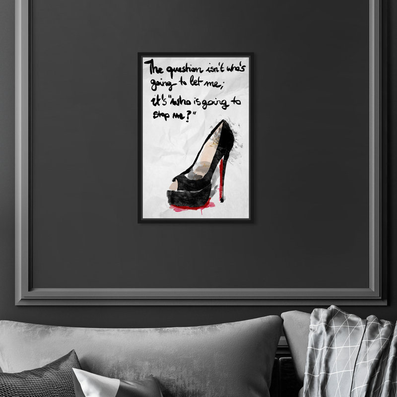 This watercolor print displays a single black heel with a red sole. Written above the heel are the words “The question isn’t who’s going to let me; it’s who is going to stop me?” in black calligraphic font.