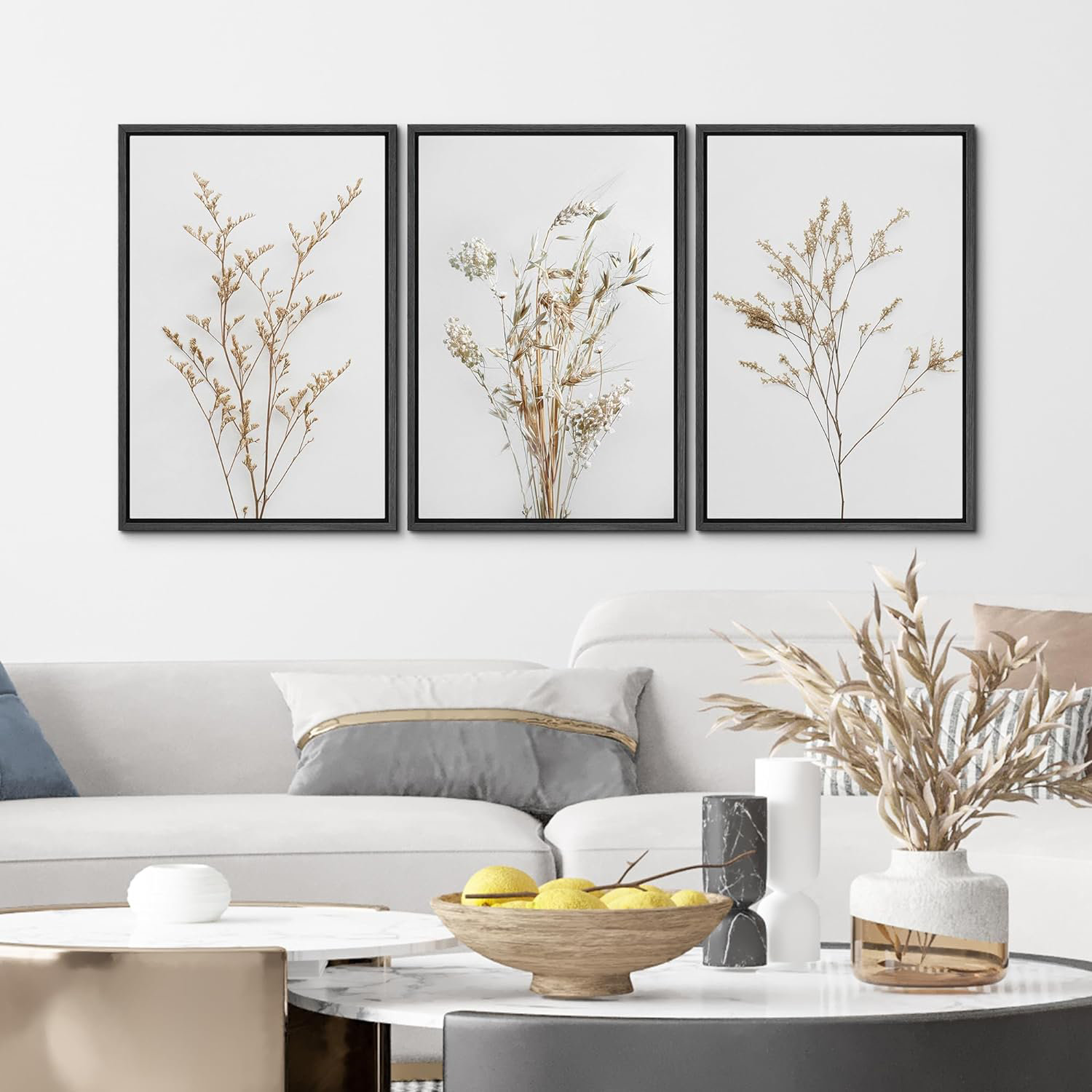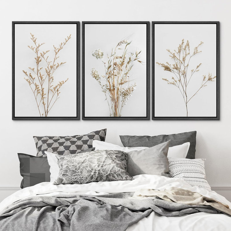 Wildflower Floral Botanical Neutral Boho Minimalist Framed Canvas 3 Pieces Pictures Print Wall Art