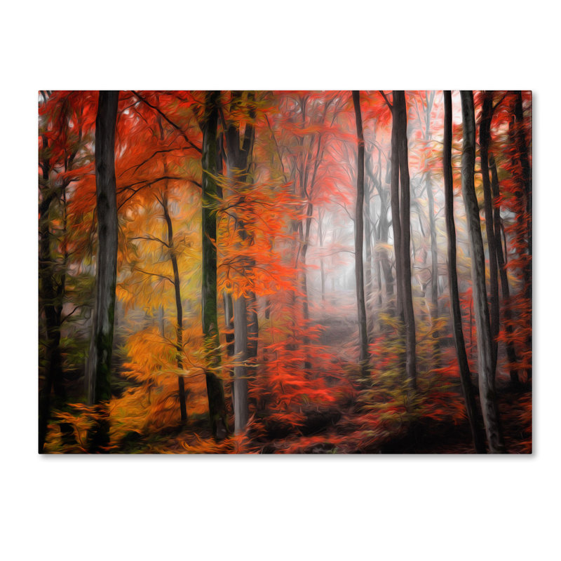 This ready to hang, gallery-wrapped art piece features a stylized fall landscape composition. Giclee (jee-clay) is an advanced printmaking process for creating high quality fine art reproductions. The attainable excellence that giclee printmaking affords makes the reproduction virtually indistinguishable from the original piece. The result is wide acceptance of giclee by galleries, museums, and private collectors. Gallery wrap is a method of stretching an artist’s canvas so that the canvas wraps around the sides and is secured a hidden, wooden frame. This method of stretching and preparing a canvas allows for a frameless presentation of the finished painting.
