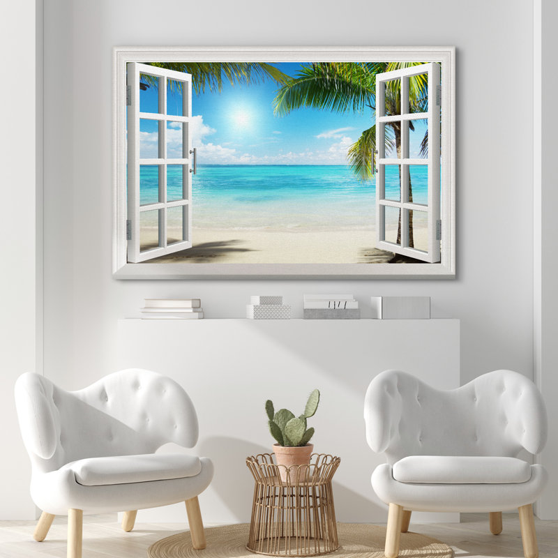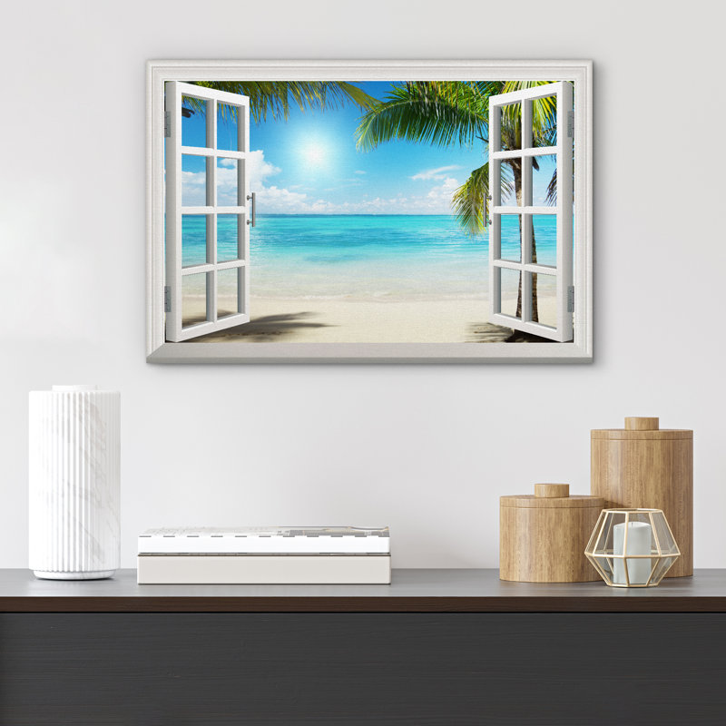 Window Scenery Tropical Green Palm Tree Coastal Beach Blue Ocean Photography Canvas Print Wall Art