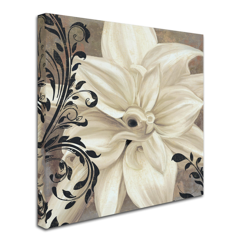 This ready to hang, gallery-wrapped art piece features a painting of a white Gerber daisy with black scroll designs drawn around it. Giclee (jee-clay) is an advanced printmaking process for creating h…. Read More.