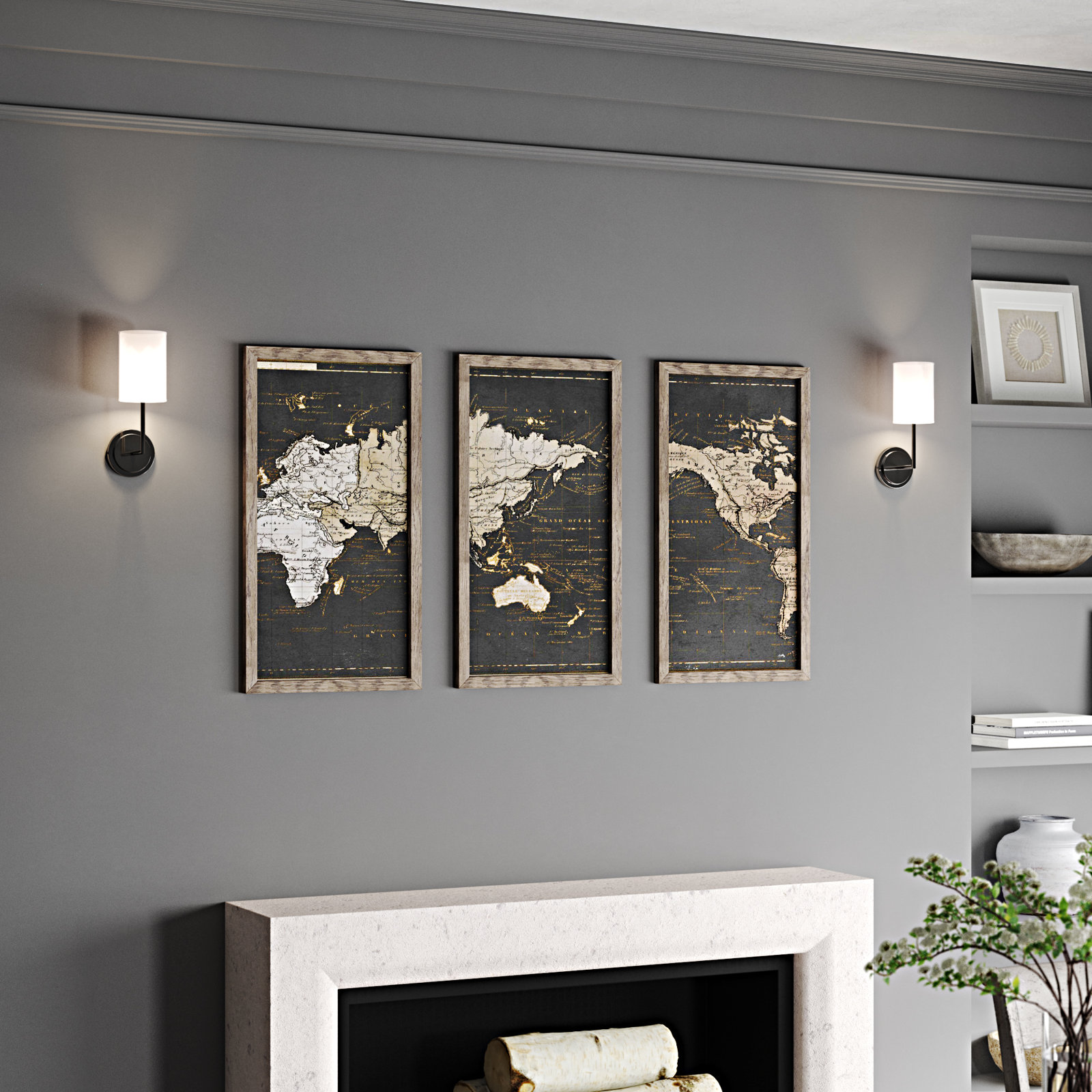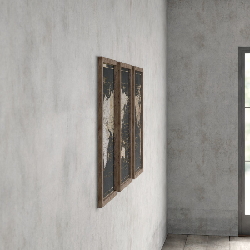 This 3-piece graphic art print set showcases a map of the world for a sophisticated look on your walls. Designed in the USA, this giclee artwork set, created by artist Elizabeth Medley, is placed insi…. Read More.