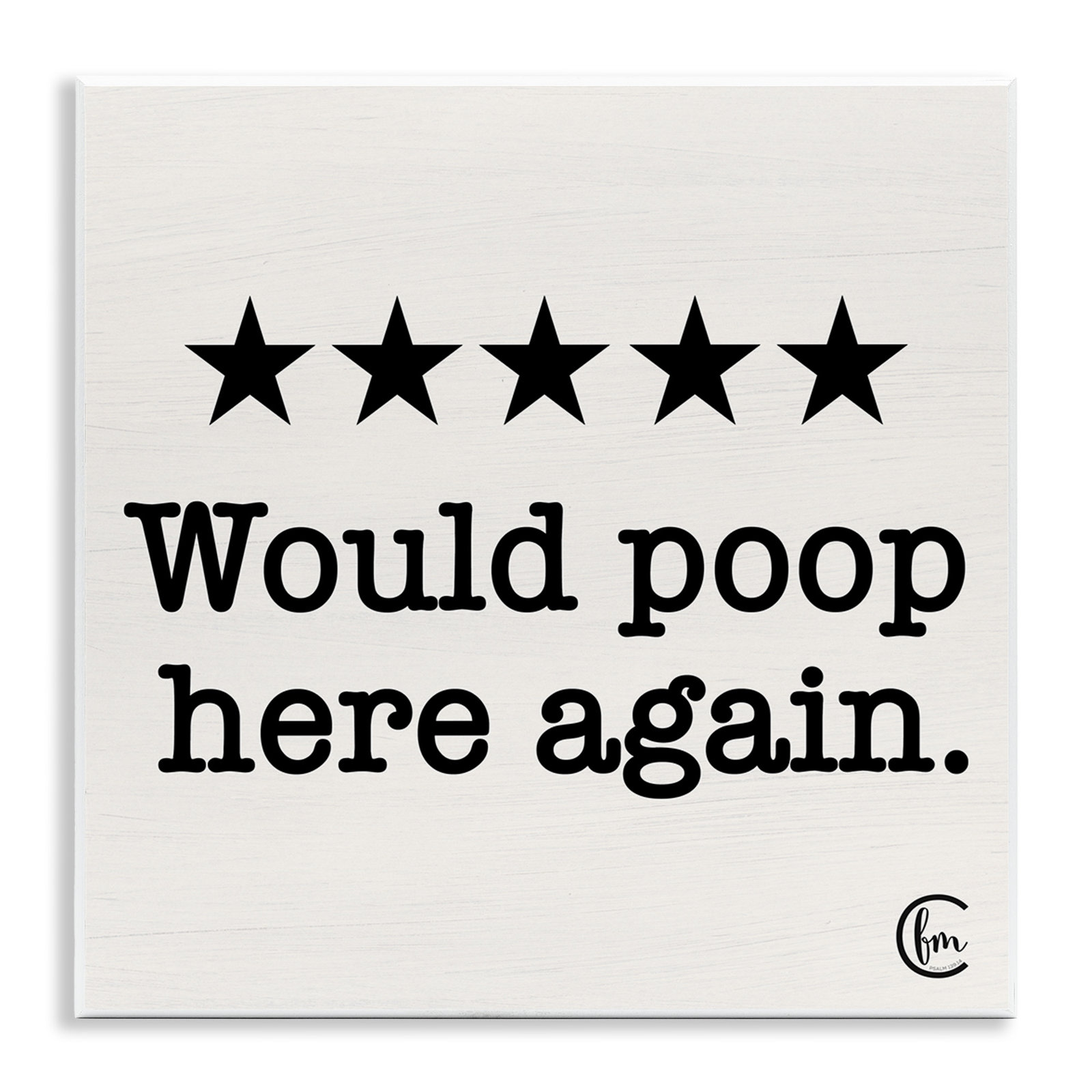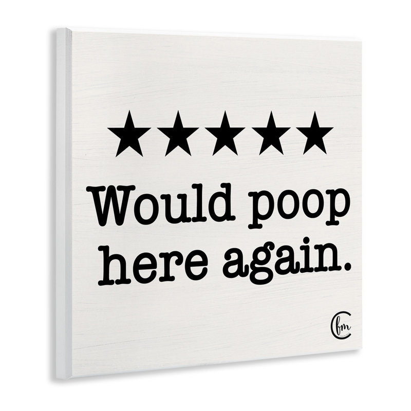 Show off your sense of humor with this tongue-in-cheek textual wall art. Designed to hang in the bathrooms of those who love to laugh, this art shows off a set of five stars and text that reads: “Would poop again.” This square piece is available in either a black framed or unframed wall plaque format, depending on your preference. Printed on wood with high-quality inks, this black-and-white artwork will add a lighthearted touch to your bathroom decor. Plus, the art comes ready to hang, so you can enjoy it right away.