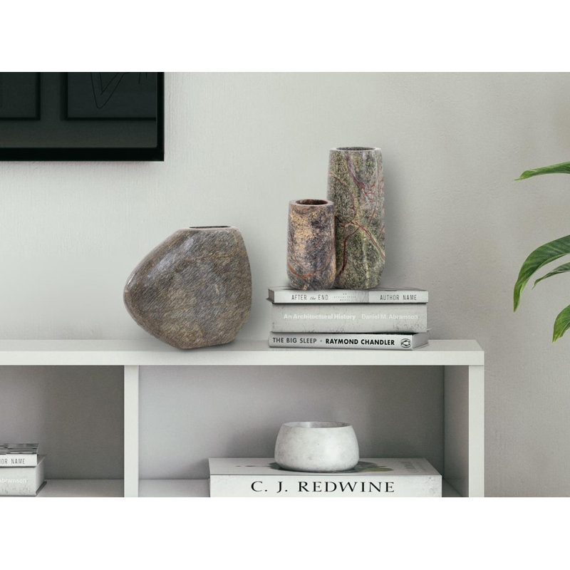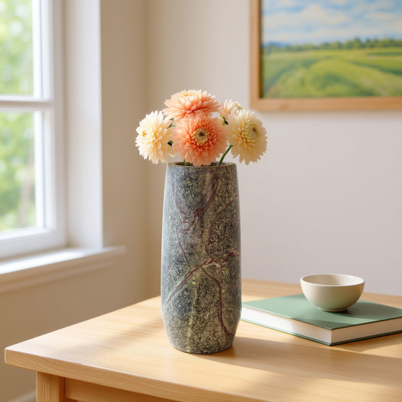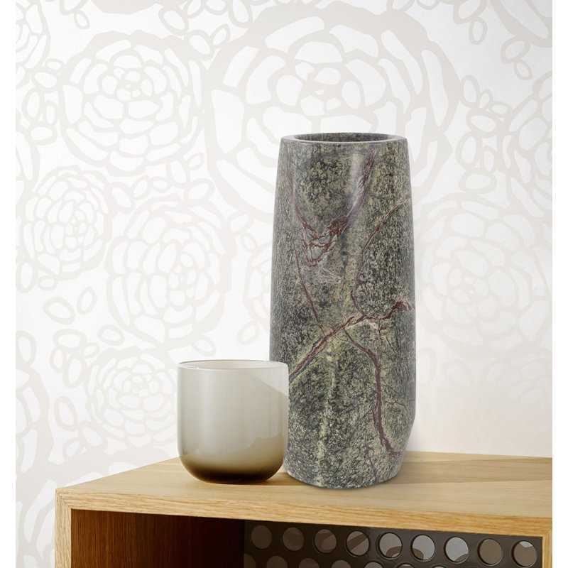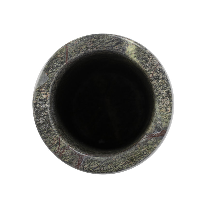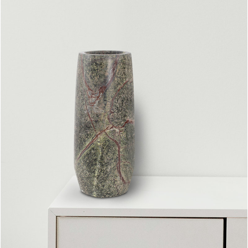 The deep rich colors of this marble created an image in our head of a lush forest with a ground cover of delicate juniper moss and rock formations. This image became the inspiration for the tall cylindrical vase. The natural veining of the stone creates a unique pattern that no two vases will share. Whether filled with flowers or used for its natural beauty this vase delivers style with a uniqueness all its own.